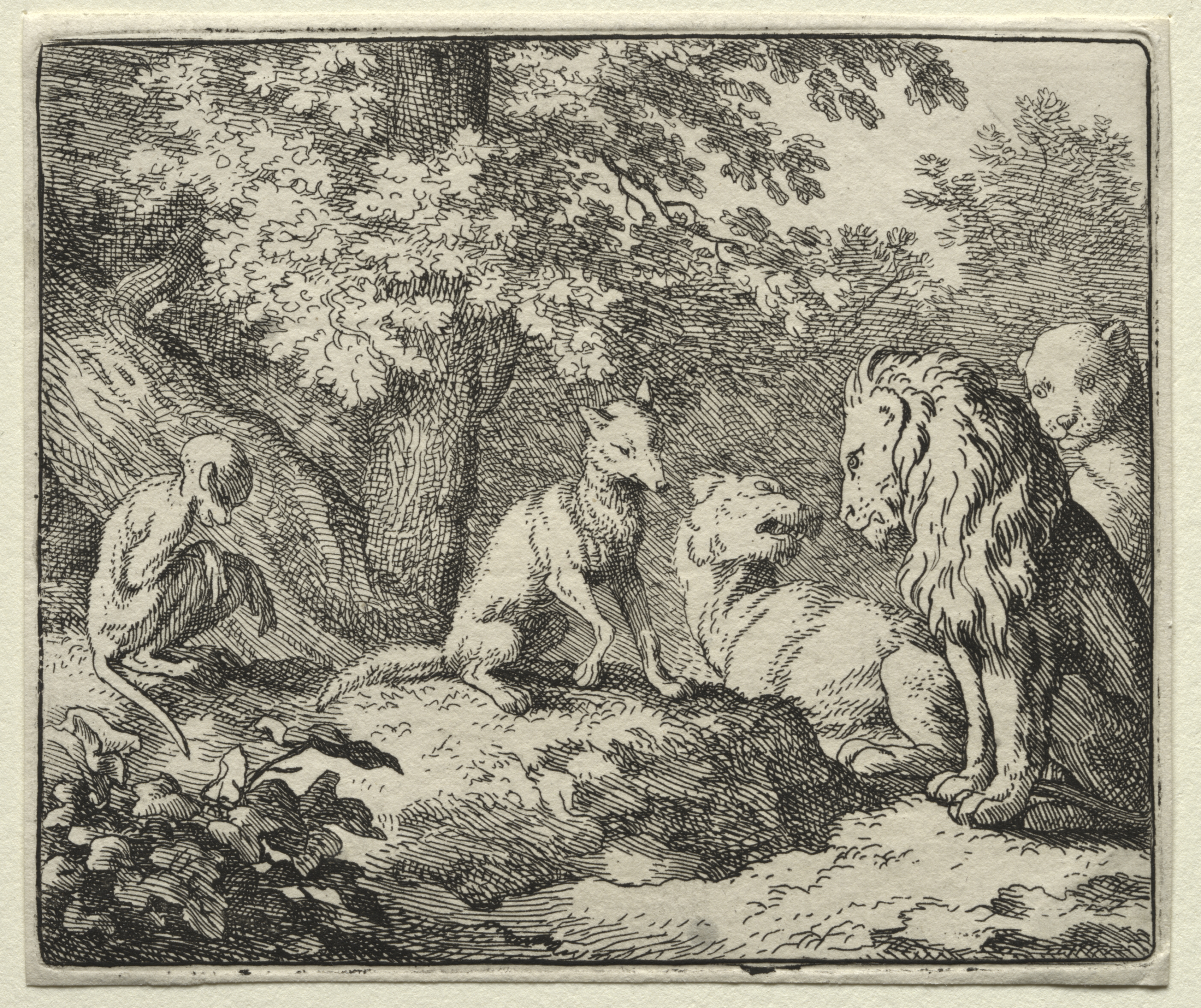 Black and white drawing of a forest scene. A monk sits on the left facing right. A fox stands on a rock in center, facing left. A lion sits on right, facing left. A bear stands behind lion, on right edge. Trees and foliage in background. A large tree trunk is on left. All four animals appear to be looking at each other. The image is rectangular with a thin border. The artist's style features detailed cross-hatching. The scene depicts several animals and a person.