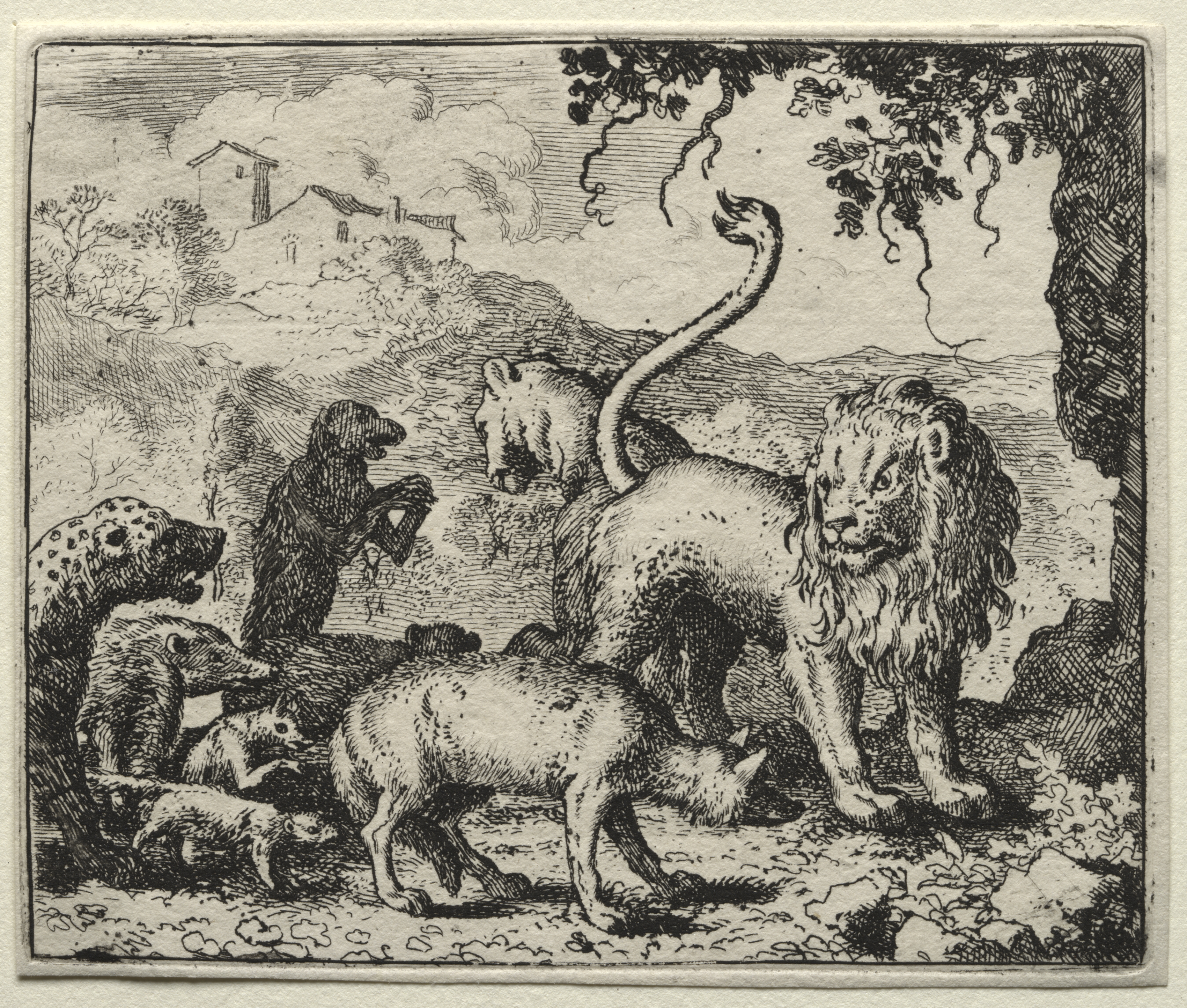 Black and white drawing of animals. Large lion standing on right side. Lion has long mane, long tail with tuft on end. Lion facing right. Small pig in front; facing left. Bear on left side; facing right. Bear bending down toward small animal on ground. Large dog on left side; sitting; facing right. Leopard behind dog; facing right. Background has tree on right; house and more trees on left; hills in distance. Sky has large clouds.
