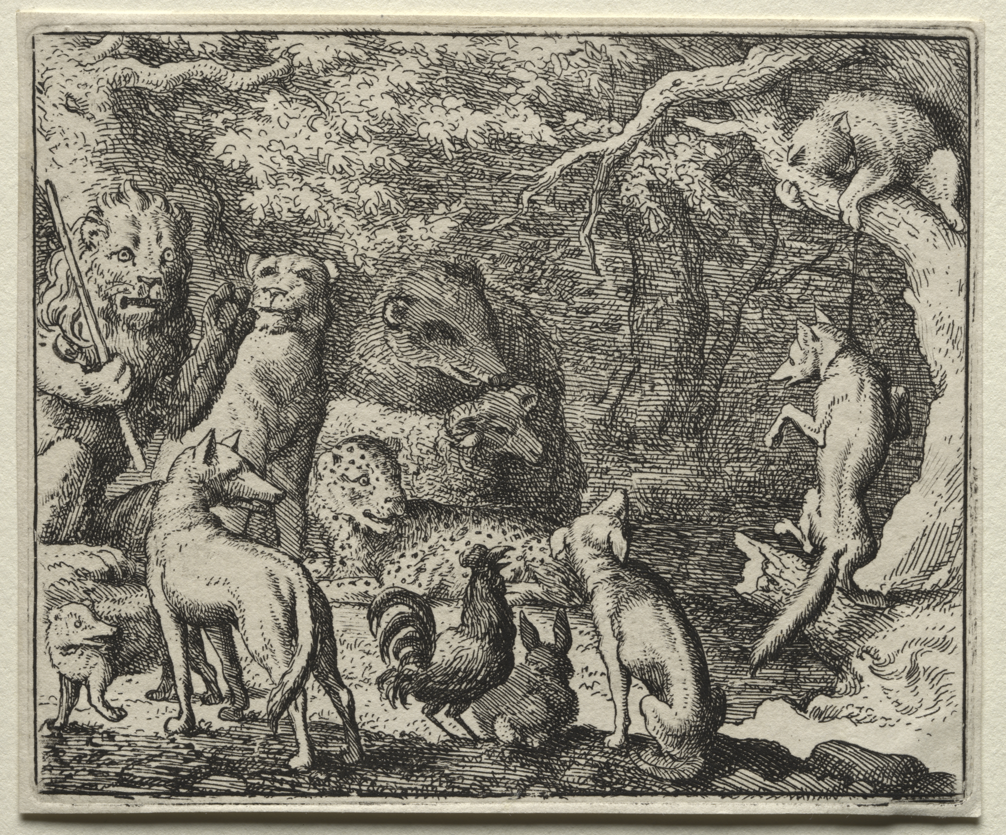 Black and white illustration of woodland scene. A large group of animals are gathered around a tree. A bear on the far left holds a long stick. A large cat-like creature and several canines are central and on the right. A feline perches on a tree on the right. A fowl stands in the center. All animals face right. Rough tree roots and shrubbery fill the background. The border around the image appears to be a slightly raised beige color.