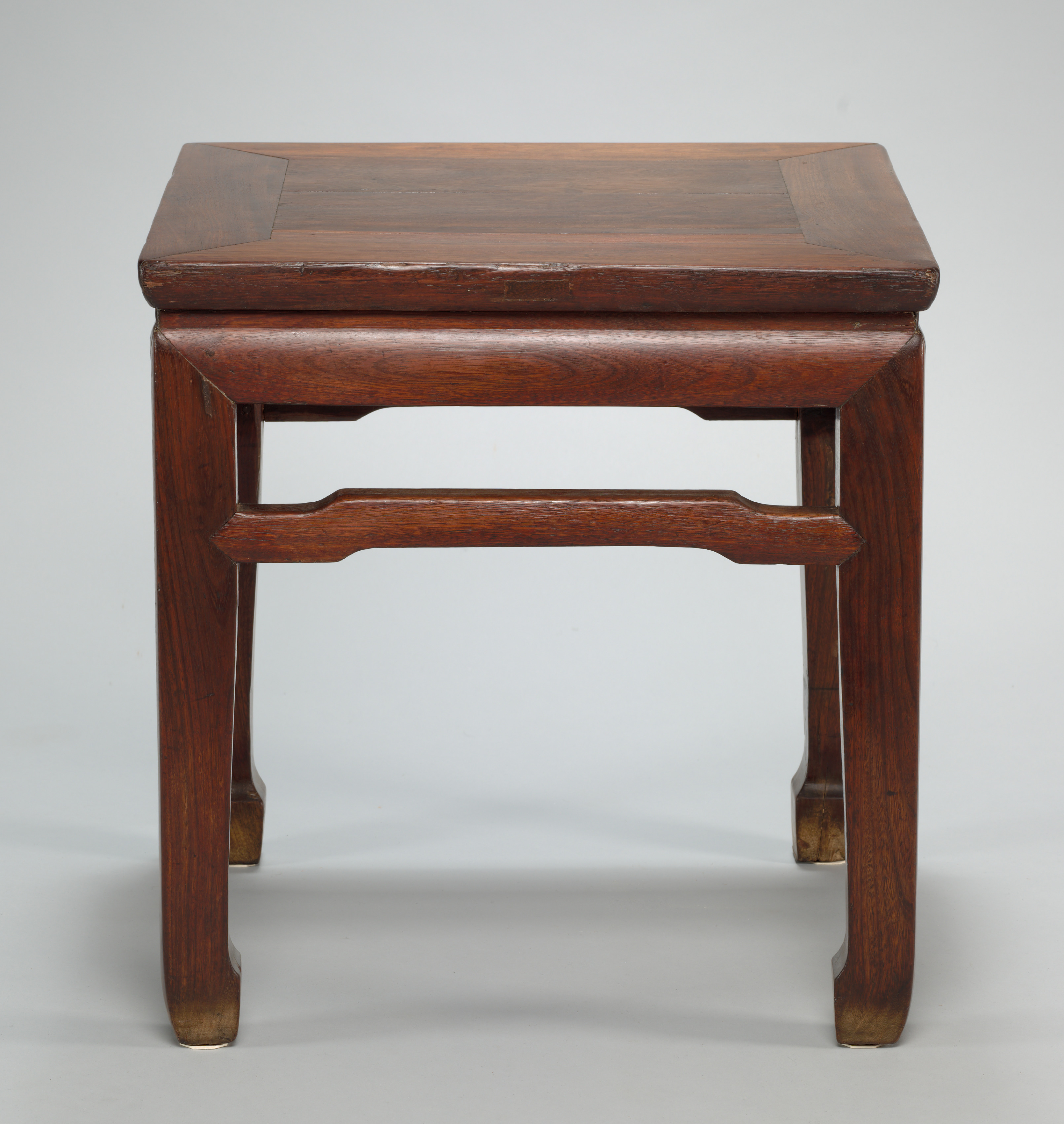 The image depicts a wooden stool titled "Stool" by an unknown artist. The stool has a rectangular seat with slightly curved edges. The top surface of the seat has a slightly darker brown square inset in the center. The four legs are thick and curved outward slightly at the bottom. The legs are connected by a horizontal stretcher in the middle. The legs have small metal plates at the bottom. The background is light gray.