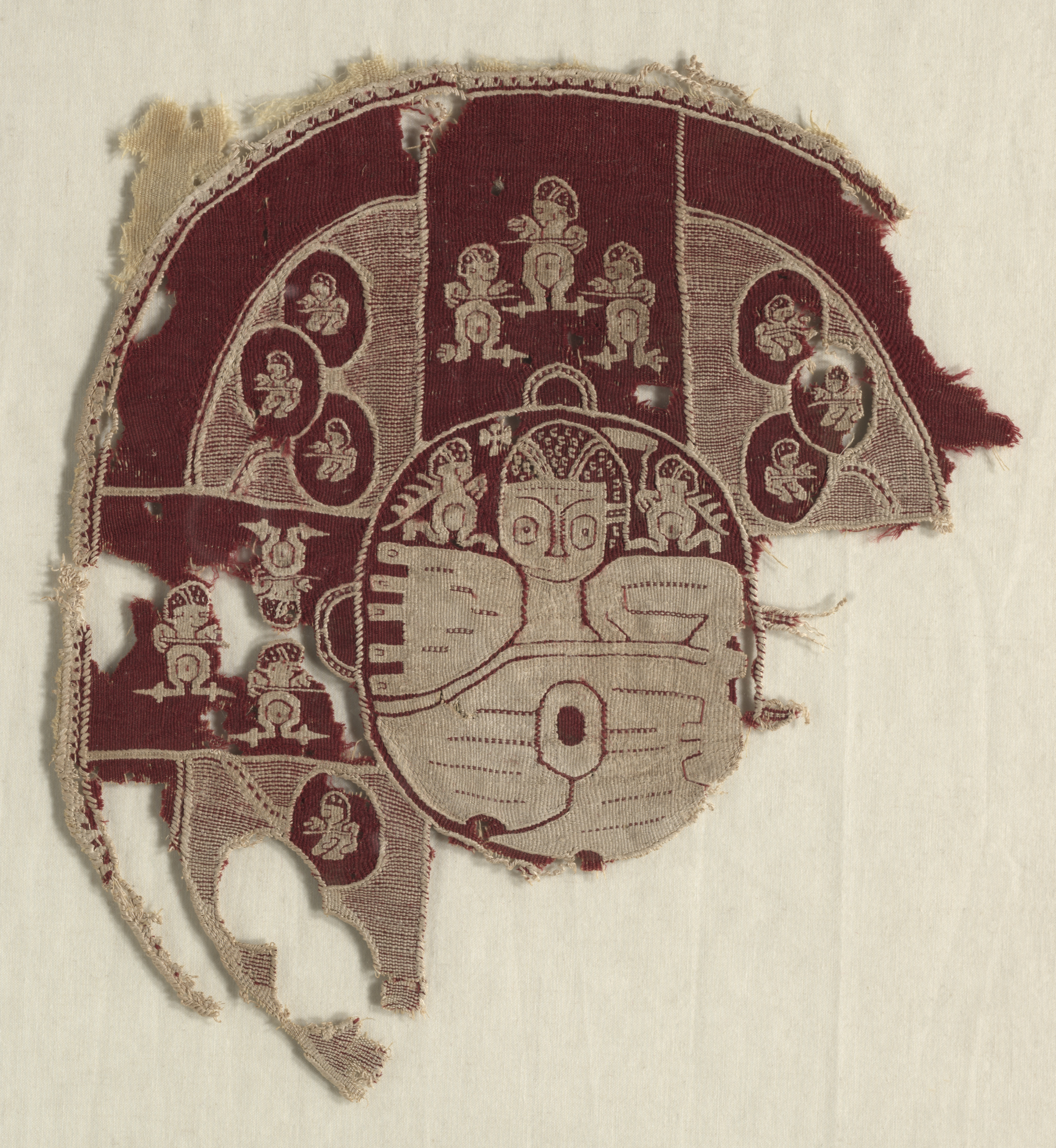 Maroon and tan tunic or shawl ornament with a face in the center, symmetrical patterns above. Semicircular shape. Jagged edges.