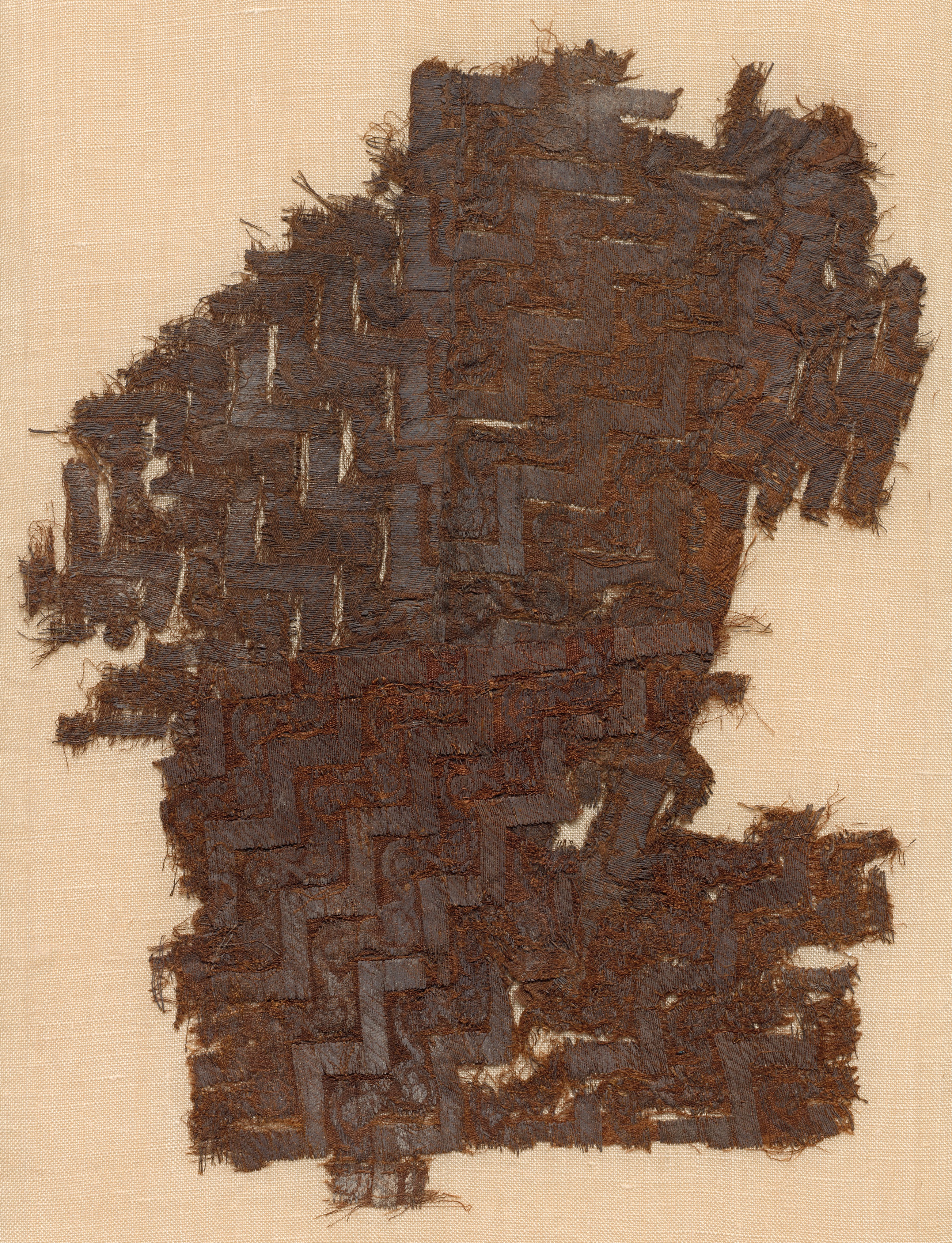 Brown woven fabric fragment on beige background, titled "Fragment" by artist Anni Albers. The fabric is made of interwoven dark brown threads in a zigzag pattern, with frayed edges and loose threads. The beige background is a plain, neutral color that provides contrast to the woven fabric.