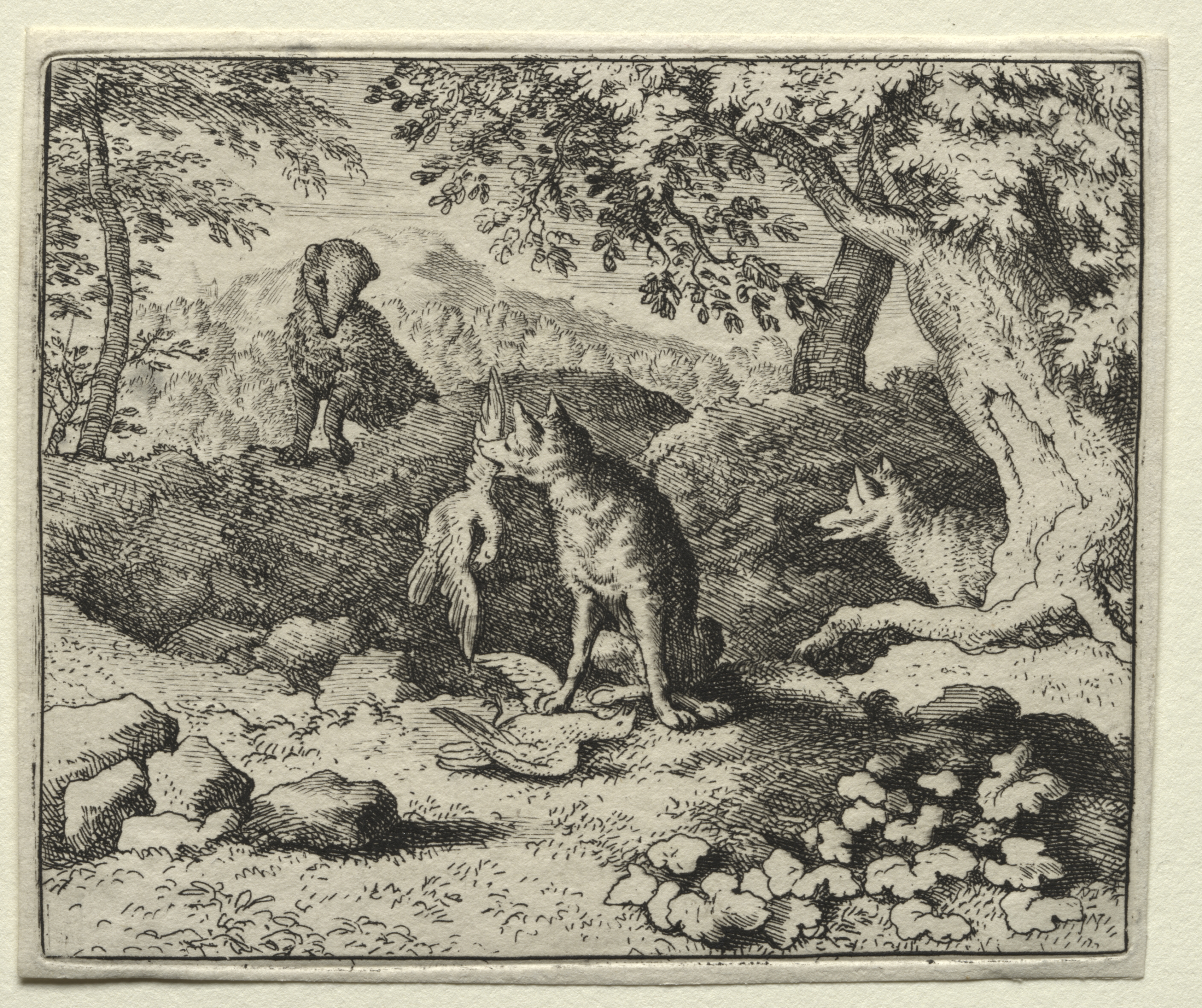 Black and white drawing of a forest scene with two animals. A standing fox-like creature holds a dead bird. A second creature, resembling a badger with darker fur, stands on a higher ground facing the fox, appearing to converse. A tree trunk with roots and leaves is on the right. A distant mountain range is visible. Several rocks and a pile of flowers or mushrooms are in the foreground. The scene depicts a moment from "Reynard the Fox" by Allart van Everdingen.