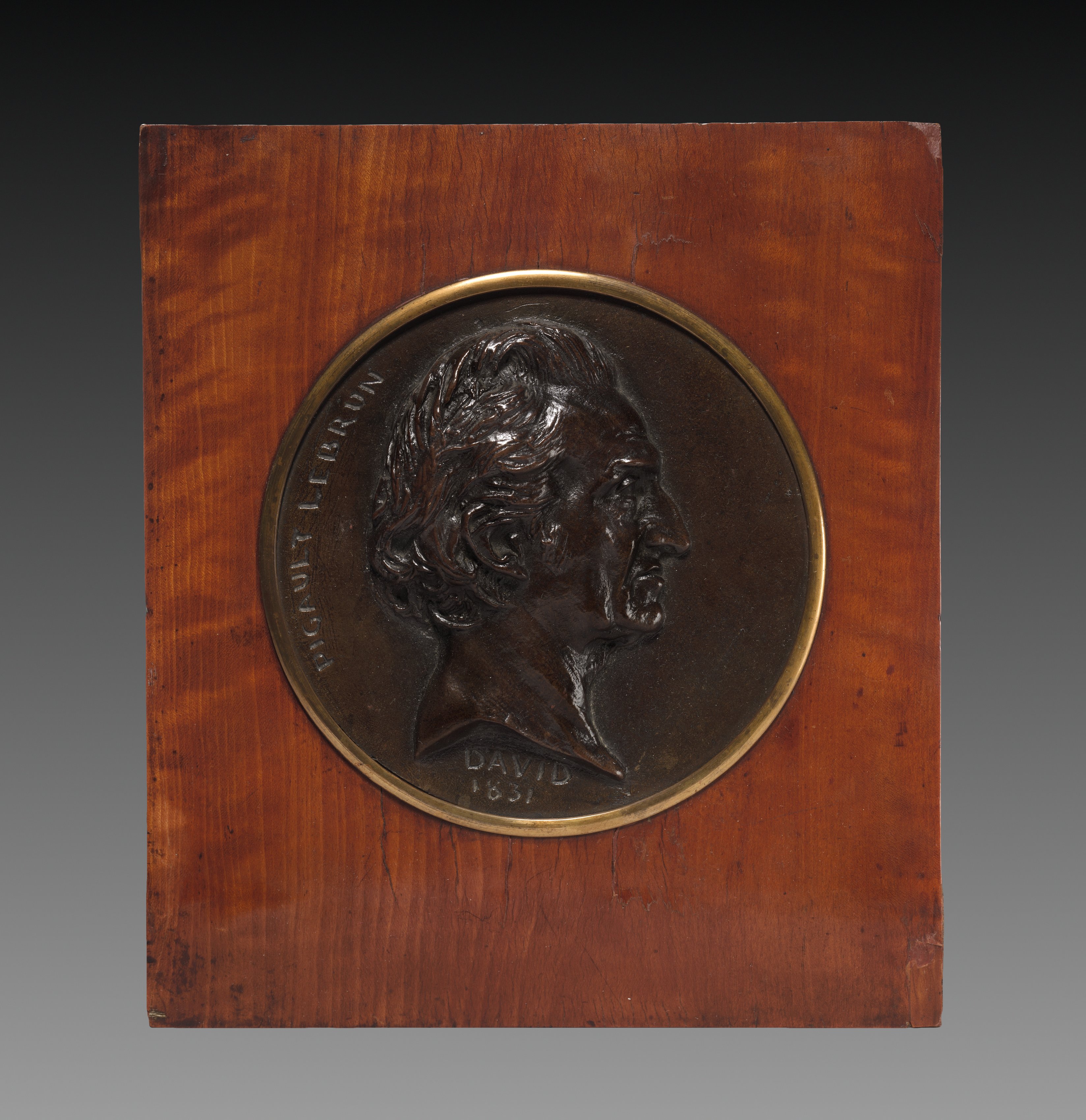 Bronze medallion mounted on a wooden plaque. The medallion is circular with a raised bronze border. It features a relief sculpture of a man's head in profile, facing right. The man has curly hair. The medallion has a dark brown patina. Inscription along the left edge. The wooden plaque is rectangular and has a reddish-brown color with a wood grain pattern. The background behind the plaque is gray gradient that is black at the top and white at the bottom.