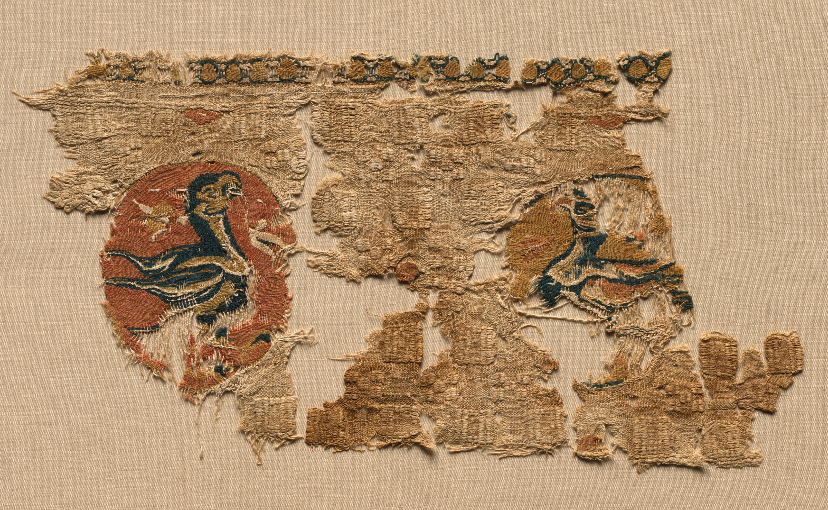 The image depicts a fragmented piece of fabric featuring two bird designs within roundels, likely created by an unknown artist. The fabric is beige and torn in multiple places, with frayed edges. At the top of the fabric, there is a border with a pattern. The fabric features two circular designs with birds inside. The left circle has a brown background with a black and gold bird. The right circle is partially visible but appears to have a similar design. The fabric background is beige. The artwork is titled "Hanging with birds in roundels".