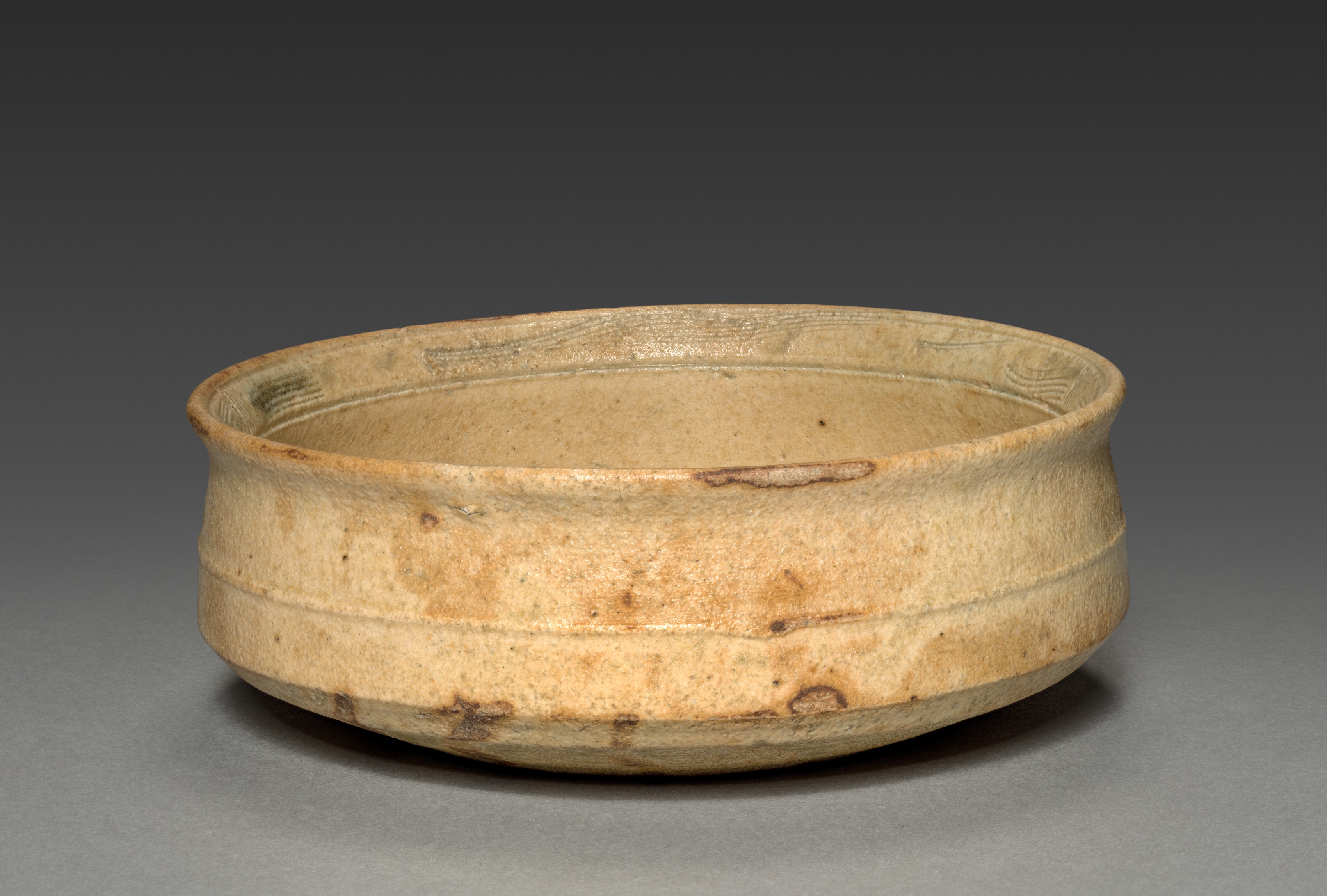 The image depicts Yellow Seto Ware bowl by an unknown artist. The bowl is round and shallow with a wide mouth. It has a light beige color with darker brown spots and lines throughout. There are two raised lines around the bowl, one near the top and one near the bottom. The background is a gradient from dark gray at the top to light gray at the bottom. The bowl casts a shadow on the surface below it.