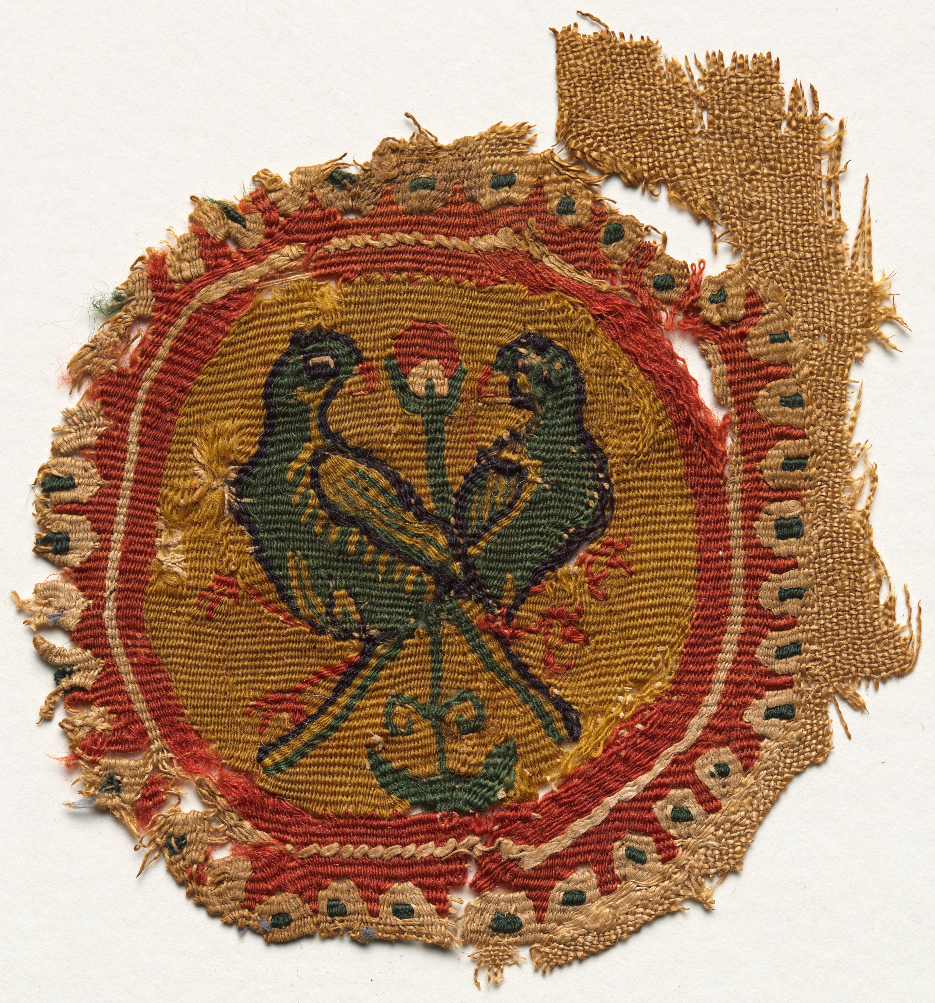 Segmentum from a Tunic by Artist Unknown. The image shows a circular segment of fabric with frayed edges. The fabric is primarily gold with a red border. Inside the red border is a second gold border. The center of the fabric has two green birds facing each other. The birds have yellow and orange details. The birds are standing on a green branch. The background behind the fabric is plain white. A small piece of fabric is detached from the upper right side. The fabric appears to be woven with intricate patterns. The edges of the fabric are worn and frayed. The fabric has a symmetrical design.