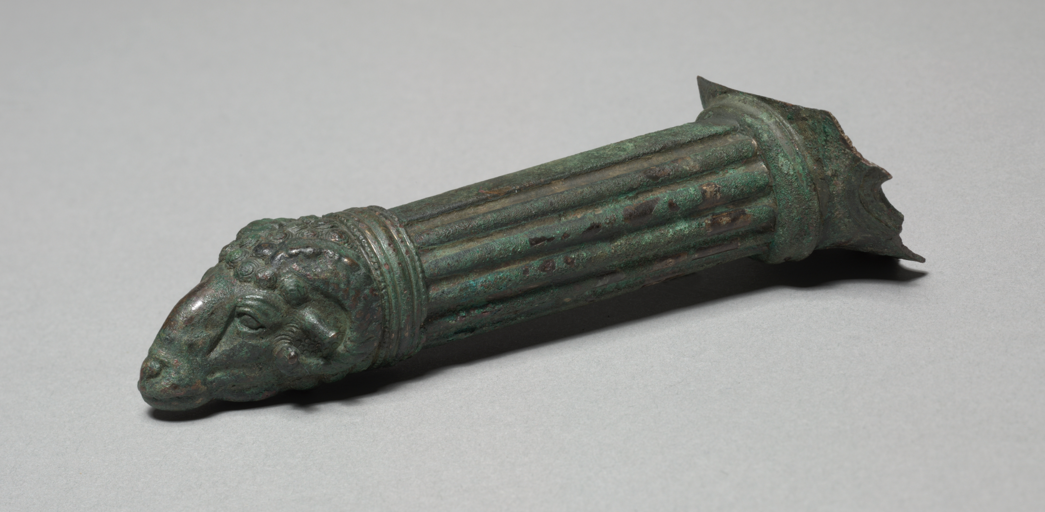 Greenish metal object, long and cylindrical, with one end featuring a sculpted human-like face with a nose, closed mouth and eyes. The face is surrounded by a decorative border. The object has a series of vertical grooves along its length, and is capped at the other end with a decorative edge that has several points. The object has a weathered appearance. Title: Patera Handle. Artist: Unknown.