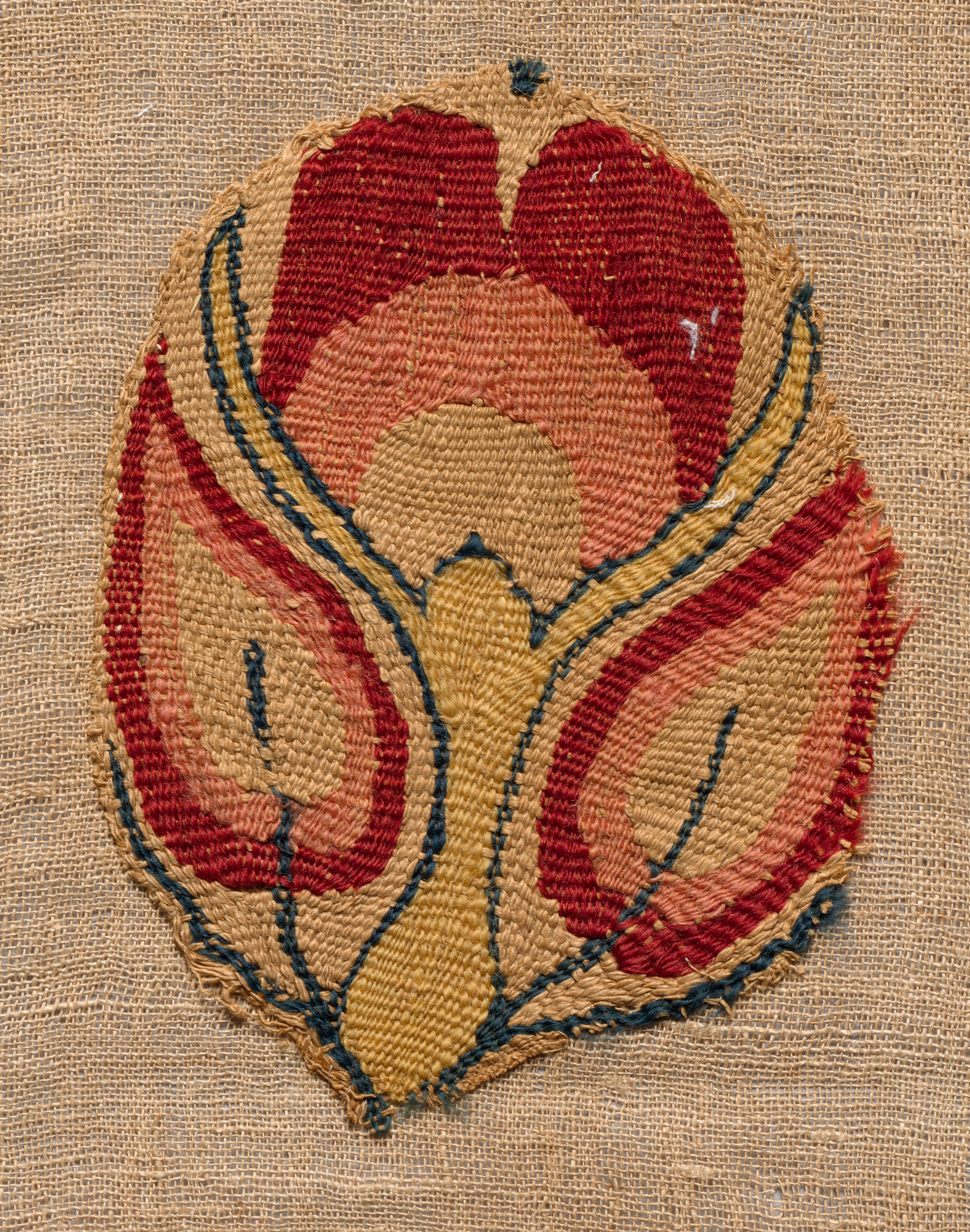 The image shows a fragment from a curtain with a flower design. The flower has a yellow center and red outer petals. The flower has blue stitching outlining the petals and stem. The background of the image is a light brown fabric that resembles burlap. The fabric appears to be woven with a grid-like pattern. The image from "Fragments from a Curtain" by an unknown artist. The edges of the fabric are frayed and rough. The flower design is circular with a stem extending downwards. The colors used are red, yellow, and blue on a brown background.