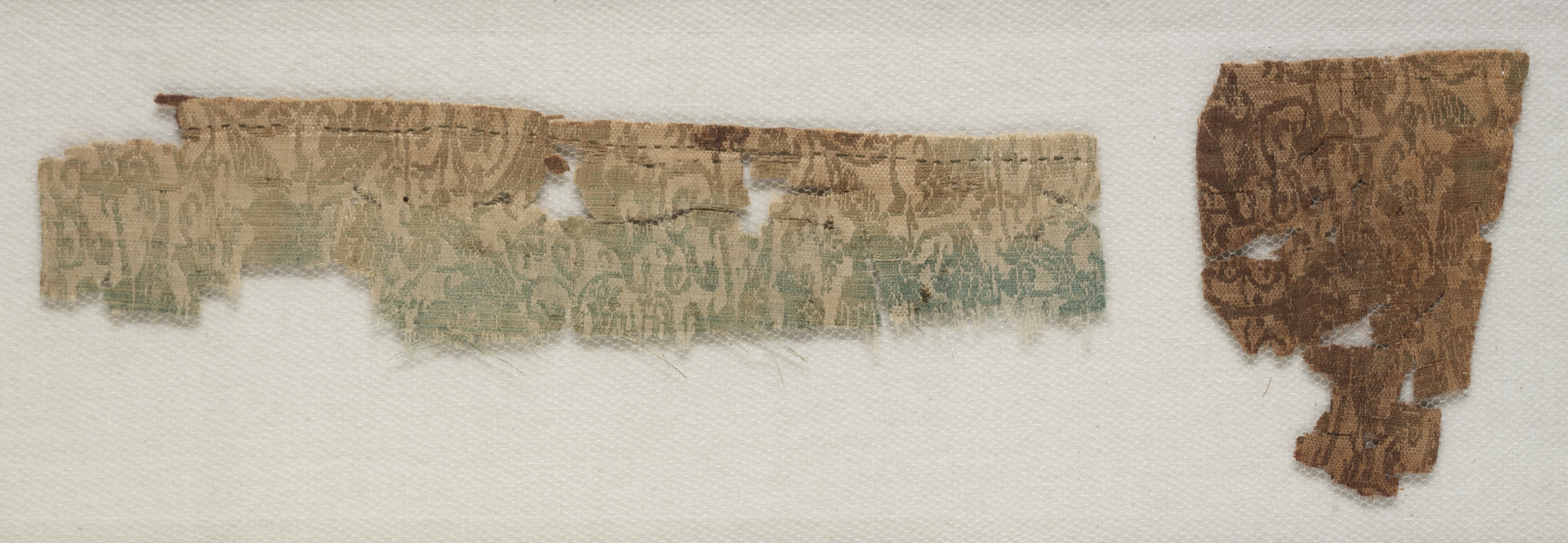 The image shows two pieces of torn and worn fabric, possibly textile fragments. The piece on the left is long and rectangular with uneven edges, predominantly tan with some green at the bottom. The piece on the right is smaller, more irregularly shaped, and brown. Both pieces have a patterned design that is difficult to discern due to their worn state. The background is off-white. The title of the artwork is "Fragments" by an unnamed artist.