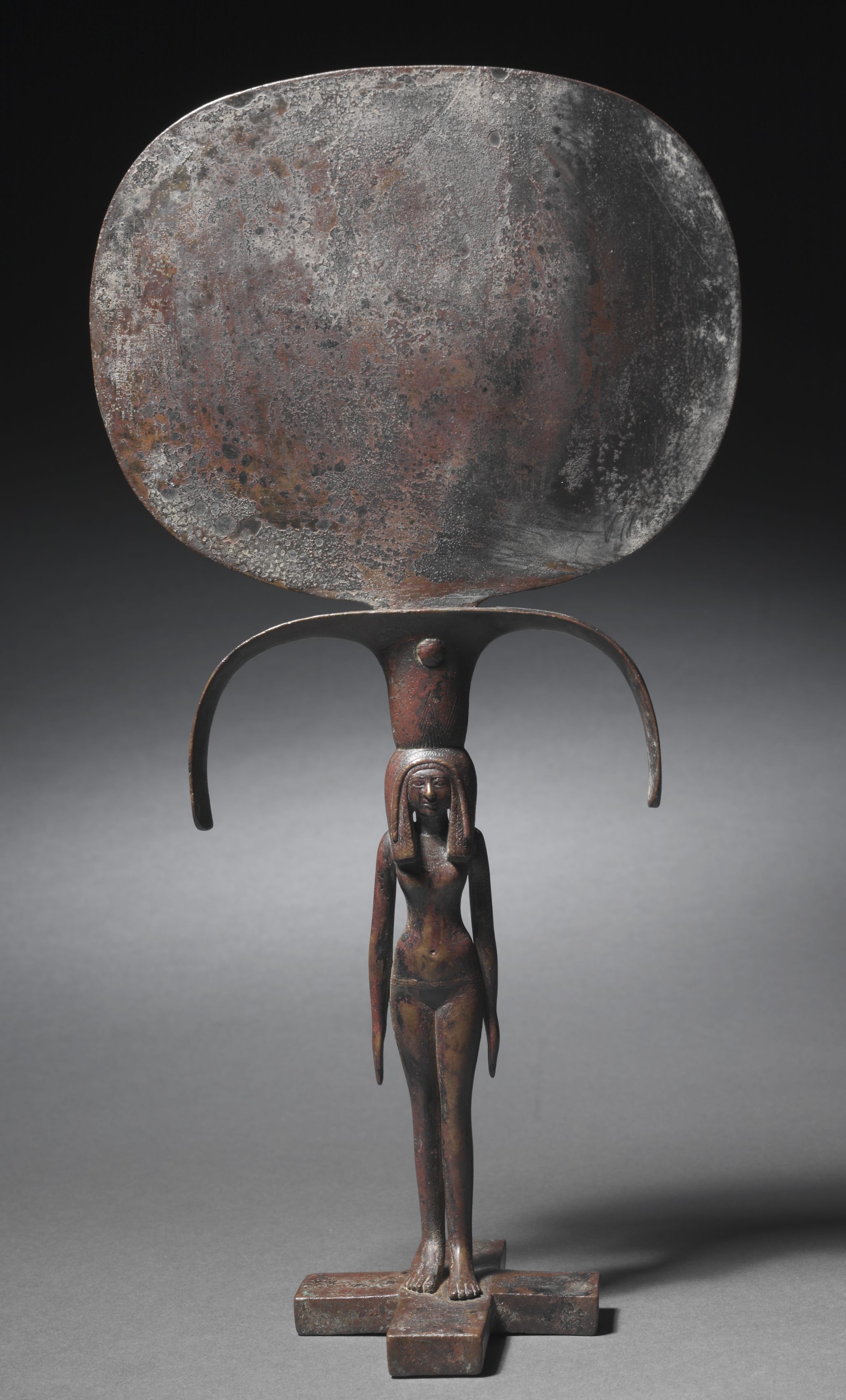 The Caryatid Mirror depicts a bronze sculpture comprising a woman with elongated arms supporting a large disk. The woman's facial features include a large circular opening for her mouth and nose. Her body is adorned with head and arm jewelry. The sculpture stands on a square base. The disk atop her head is gray with rust-colored spots. The background of the image is a gradient transitioning from black at the top to white at the bottom.