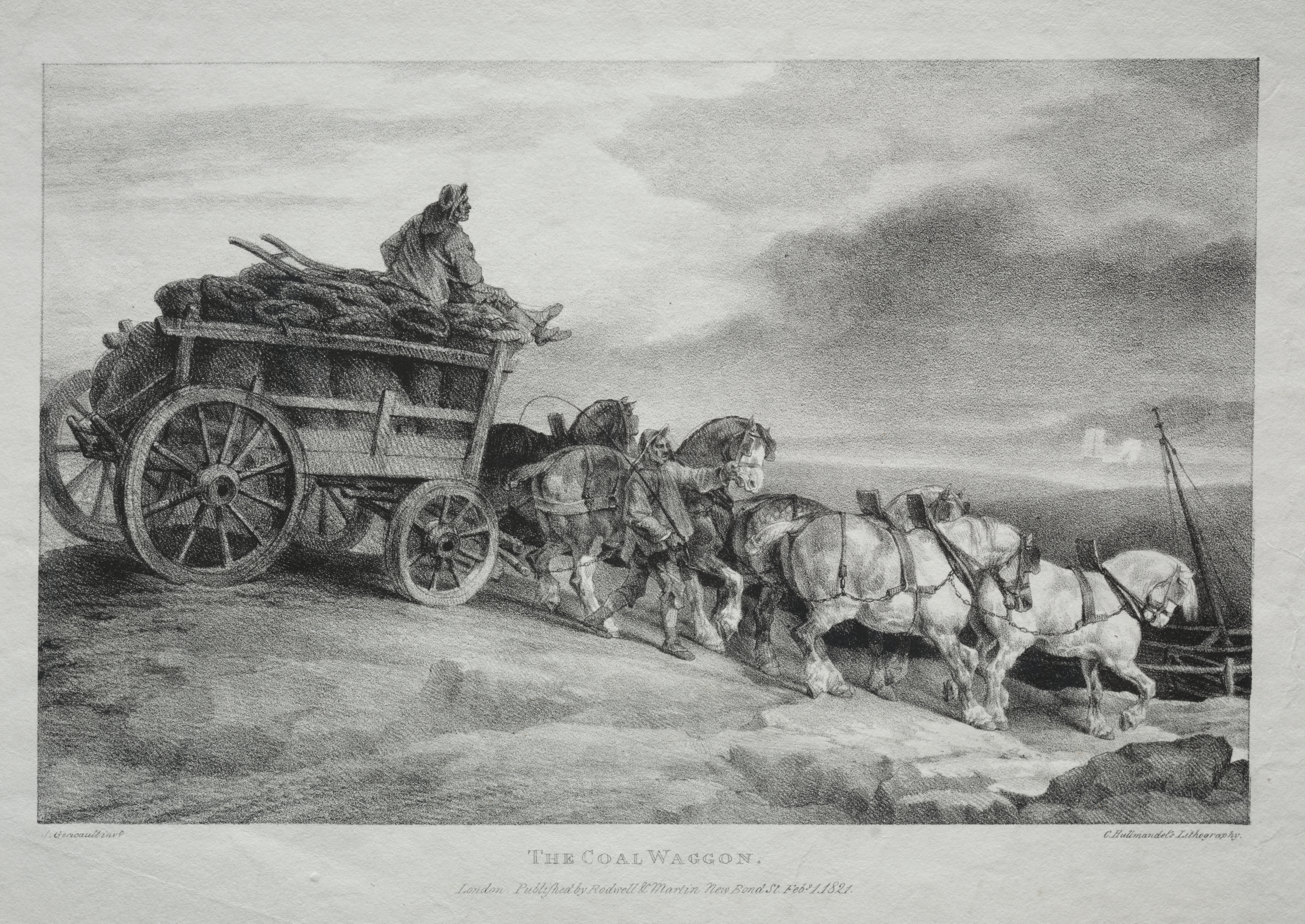 The image shows a black and white drawing of a horse-drawn wagon. The wagon has large wheels and is loaded with firewood. A man sits on top of the load. The wagon is being pulled by four horses. The horses are harnessed together and walking up a rocky incline. The lead horses are dark and light brown and the rear horses are white. The man driving the horses wears a hat and holds reins in both hands. The background shows a cloudy sky and a distant landscape. The title "The Coal Wagon" and the artist "Théodore Géricault" are associated with the image.