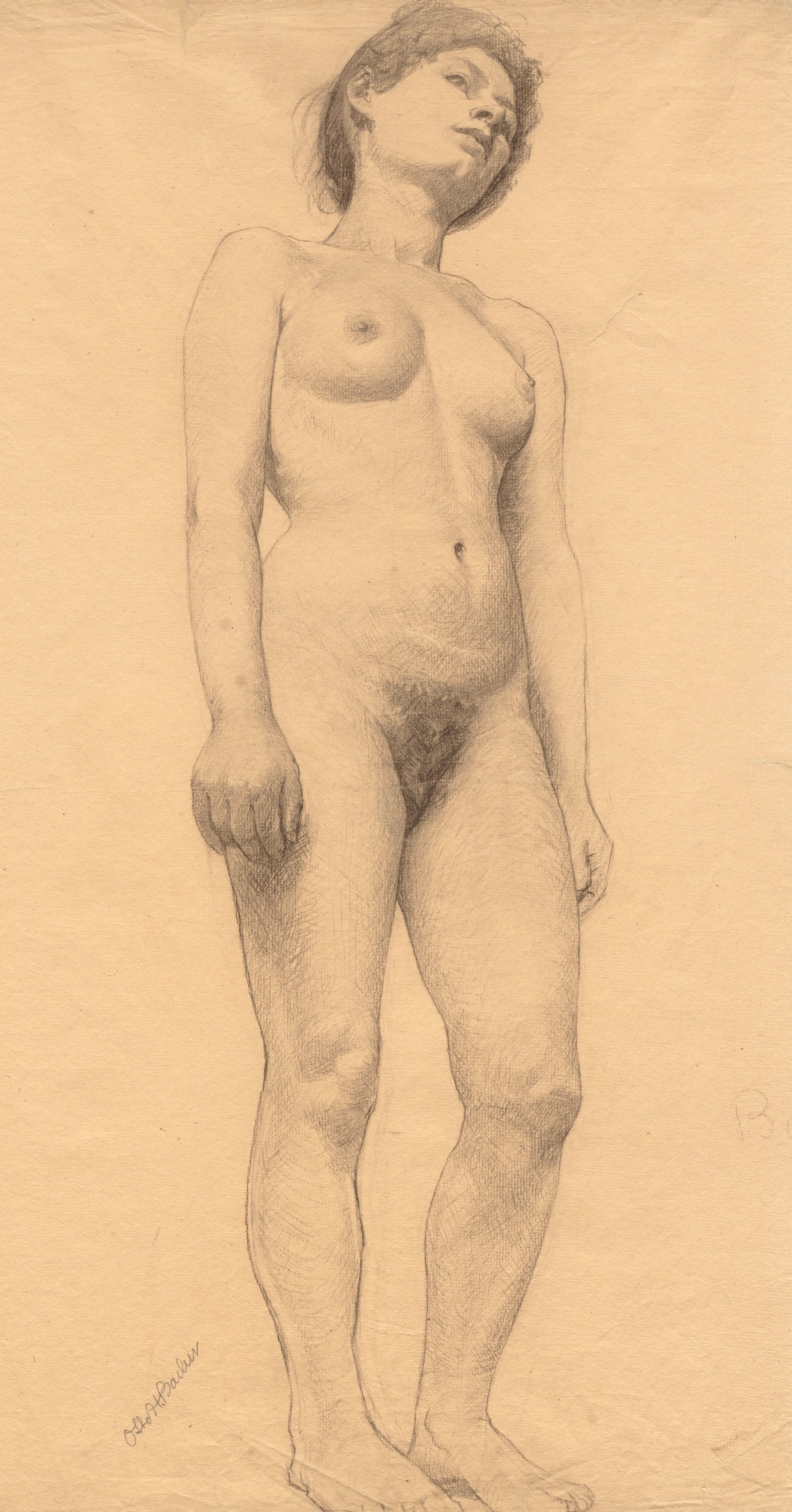 The image depicts a standing female nude. She has short dark hair. Her head is tilted back and to the right. Her eyes are closed. Her arms hang loosely by her sides. Her right leg bears weight while her left leg is relaxed. The drawing is in shades of gray on a beige background. The artist's signature appears in the bottom-left corner.