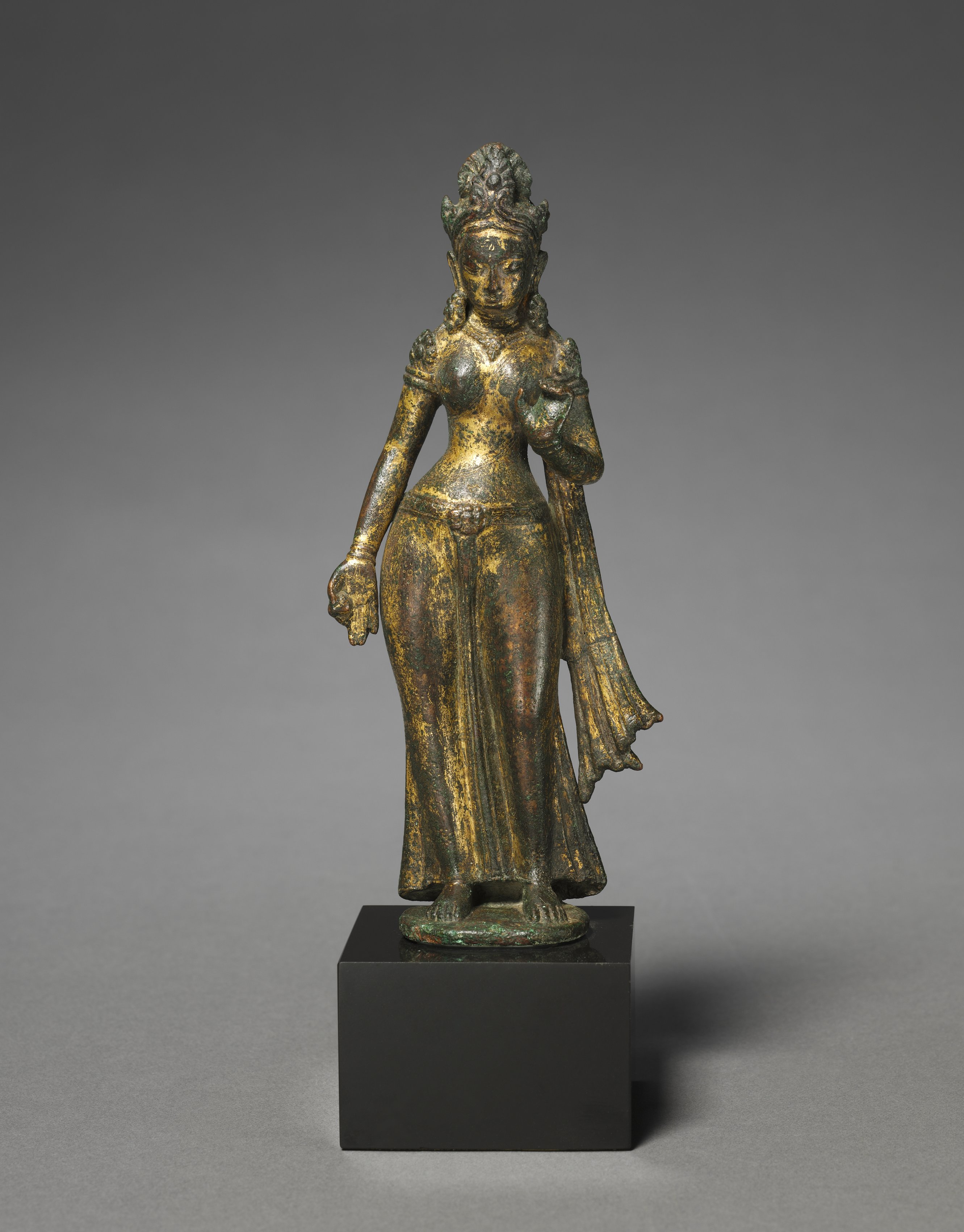 Devi, a bronze sculpture, depicts a standing female figure on a square black base, with a bronze circular base attached to the black one. The figure has a serene expression and an elaborate headdress. She wears a long skirt and has one arm bent at the elbow, while the other hangs by her side. The sculpture exhibits a predominantly gold patina with areas of green. A decorative element adorns her shoulder.