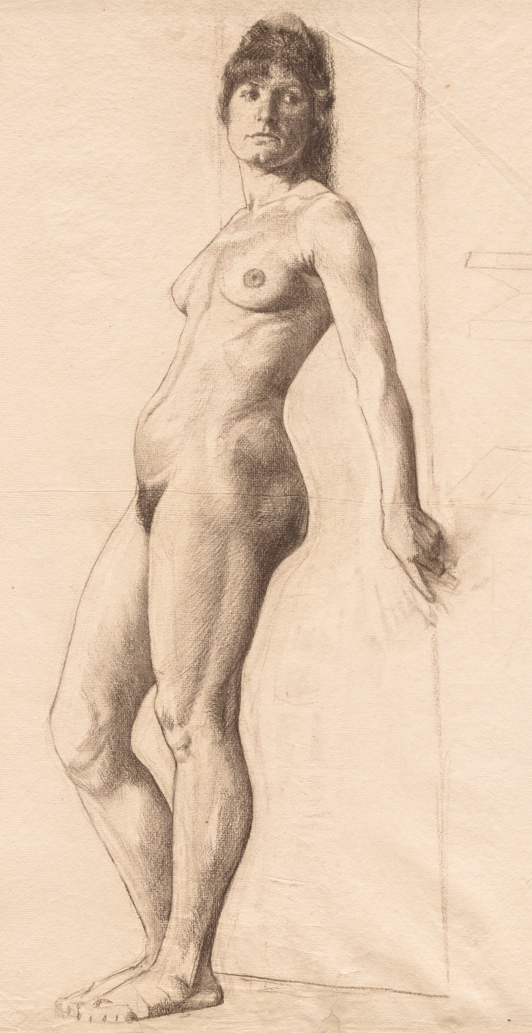 A full-body drawing of a nude woman. The model has dark hair pulled up in a ponytail. The woman's right leg is straight and her left leg is bent. Her right arm is down by her side and her left arm is extended. The woman has her weight on her right leg. The background appears to be a wall and the drawing is on light brown paper with visible sketch marks. The drawing style is realistic. The title of the piece is "Standing Nude Model" and it was made by Otto H. Bacher.