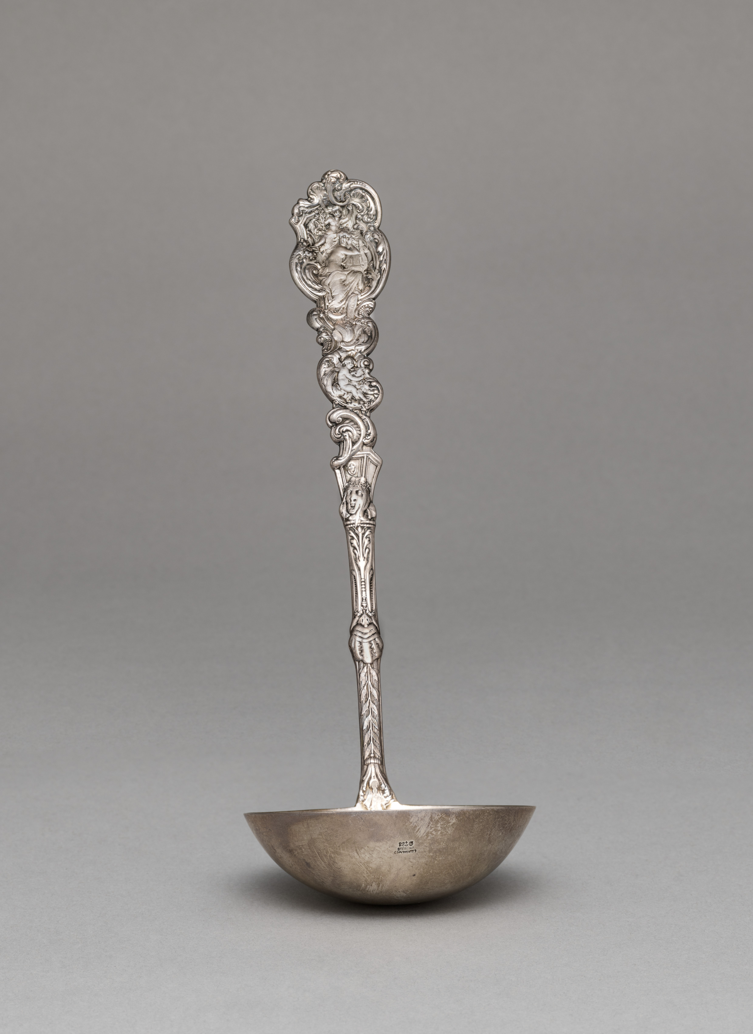 Ladle by Gorham Manufacturing Company. Silver ladle with a bowl that is wider than it is long and a long handle. The ladle bowl is rounded with a flat bottom. The handle is ornately decorated in a floral pattern and on the top is a figurine of a woman's face with curly hair. She appears to have a ribbon tied around her forehead. There are several engravings on the handle. The one on the bottom appears to be acanthus leaves. The background of the image is grey.