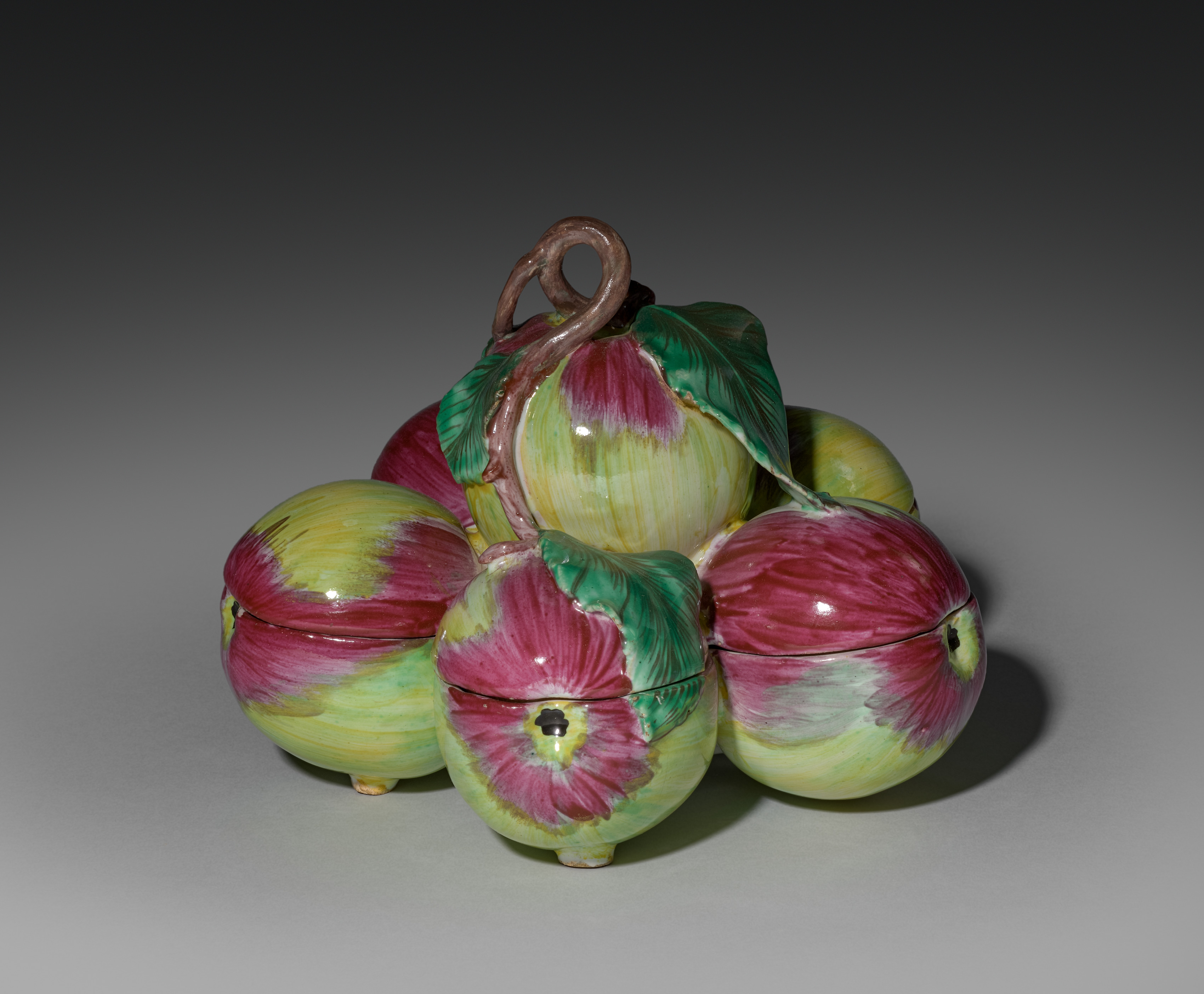 Ceramic box shaped like a bunch of apples. The box has a brown handle on top. The apples are predominantly green with red and white highlights. The apples have green leaves attached. The box is made up of six apples stacked together, with three on the bottom, two in the middle, and one on top. The apples on the bottom and middle have lids. The box is shiny and glossy. The background is dark gray, with a shadow cast by the box.