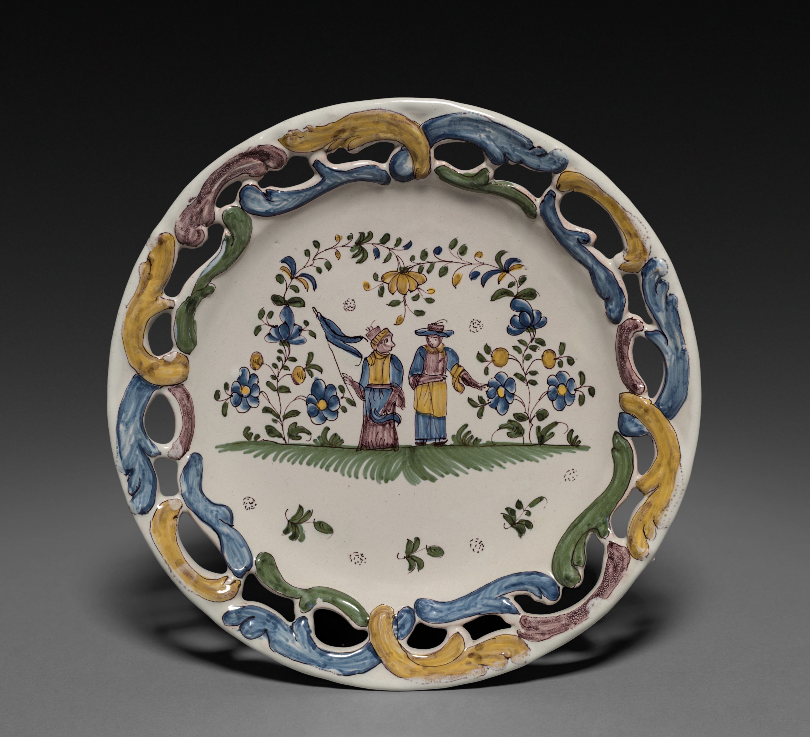 Round, white plate with colorful floral design around border, featuring blue, green, yellow and purple curved lines; center depicts two people standing on grass with blue flowers and green leaves; figure on left wears blue and yellow, holding blue flag; figure on right wears blue and yellow; background dark gray. Title: Plate Artist: Unknown
