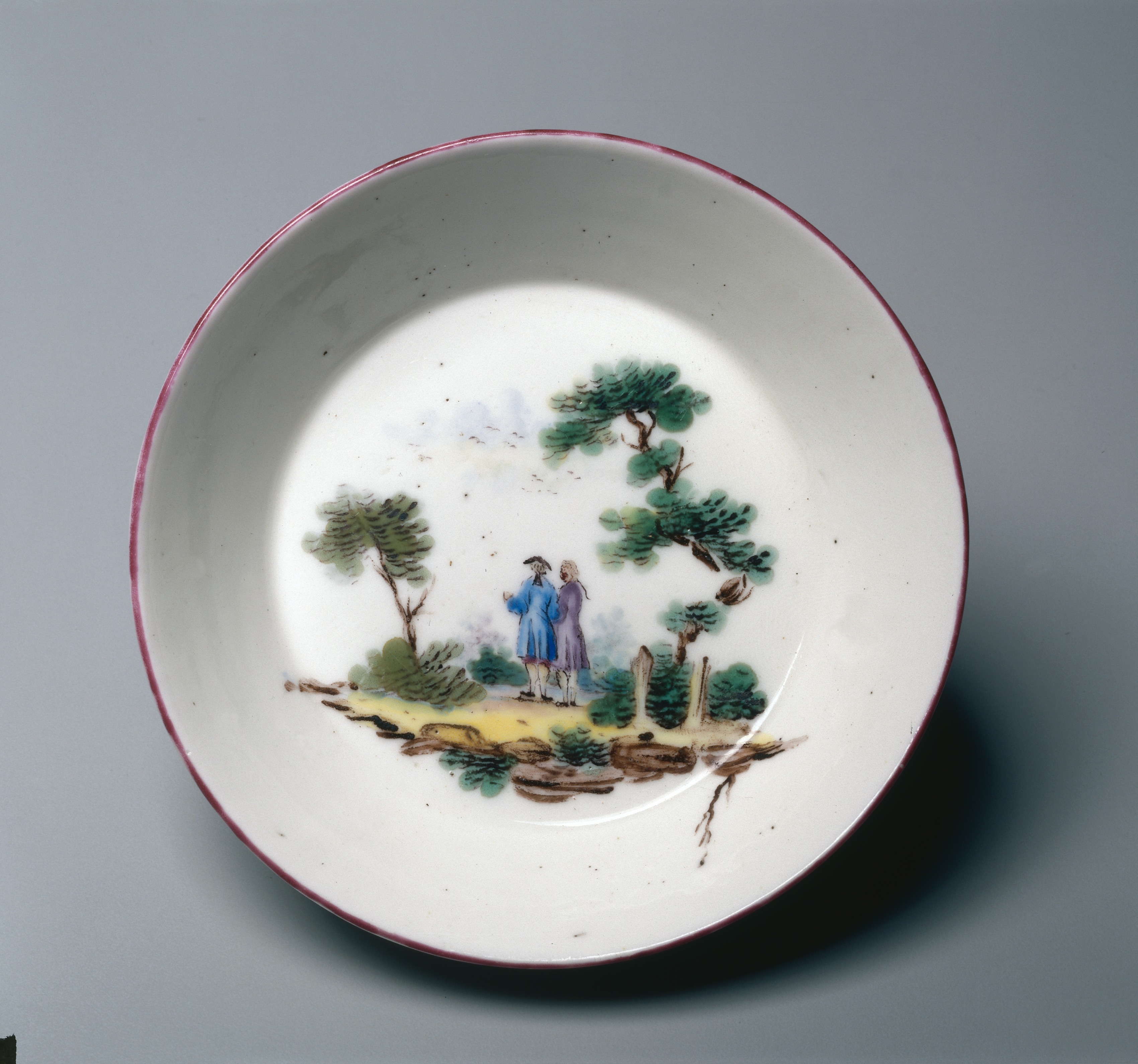 White porcelain saucer with a red rim. The interior features a painted scene of two people standing on a yellow patch of land surrounded by trees, bushes and a wooden fence. The person on the left wears a blue outfit and the person on the right wears a purple outfit. Both wear white stockings. The background of the scene is white. The saucer sits on a gray surface.