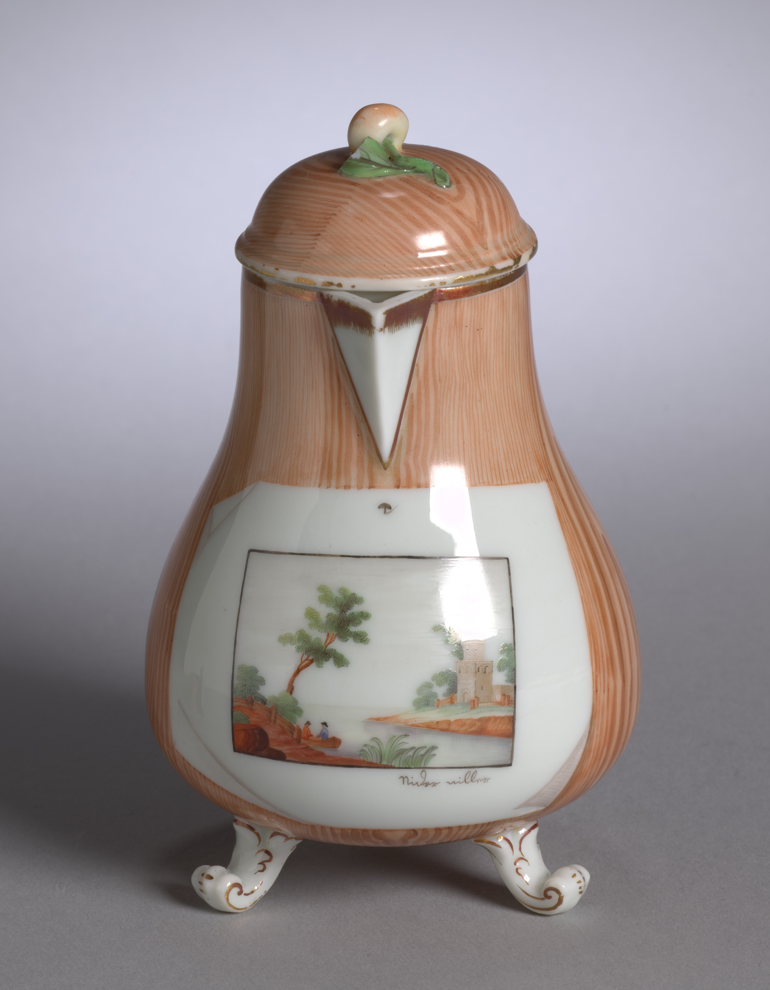 The object is a ceramic covered cream jug. The jug's base color is white with a brown wood-grain pattern on the upper half. It has a square painting on the front depicting a landscape with a tree, building, and people. The jug has a small spout on the front near the top and sits on three ornate feet. The lid is brown with a wood-grain pattern and features a small ceramic frog on top. The frog is green with a tan head. The background of the image is gray.
