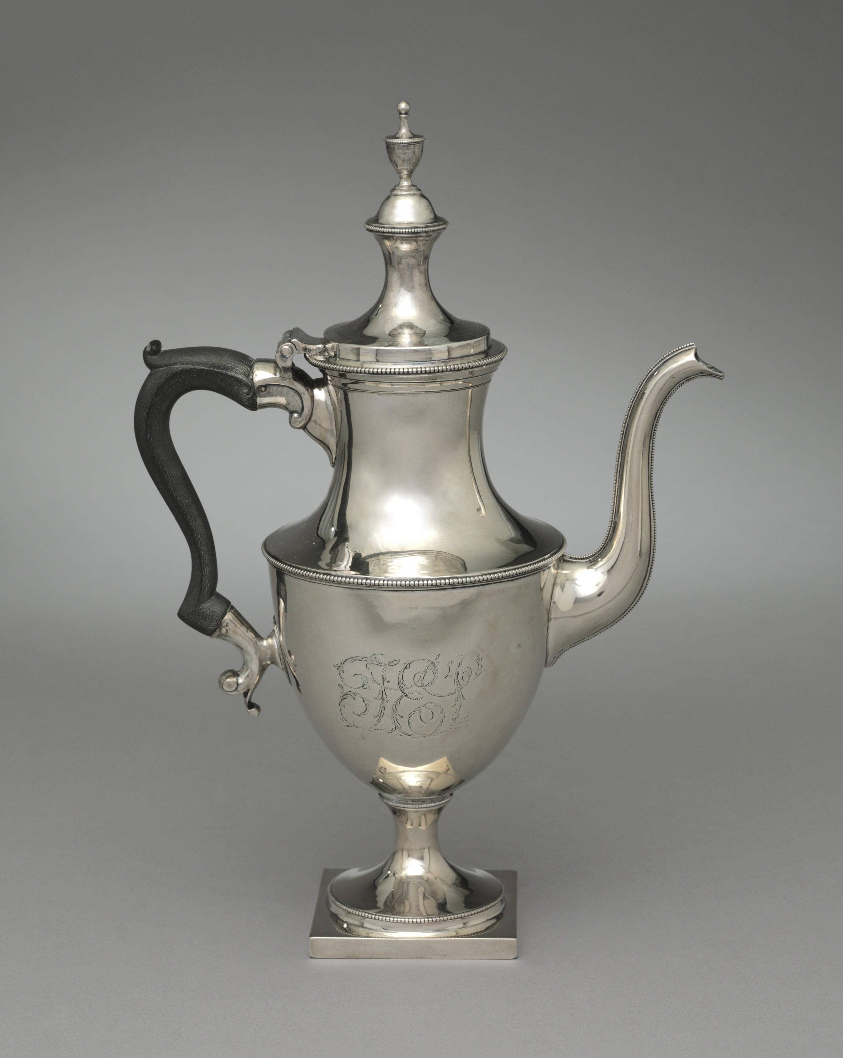 The Coffee Pot, by an unknown artist, is a silver teapot with a square base. The base connects to a short, tapered, ridged foot. A bulbous body with a rounded shoulder sits atop, featuring a scrollwork engraving on one side. A curved, ebonized wood handle attaches to the left. A stepped, domed lid is topped with a finial. A long, curved metal spout protrudes from the right side. The pot is decorated with beaded trim along the lid, body, and base. The background is gradient gray.