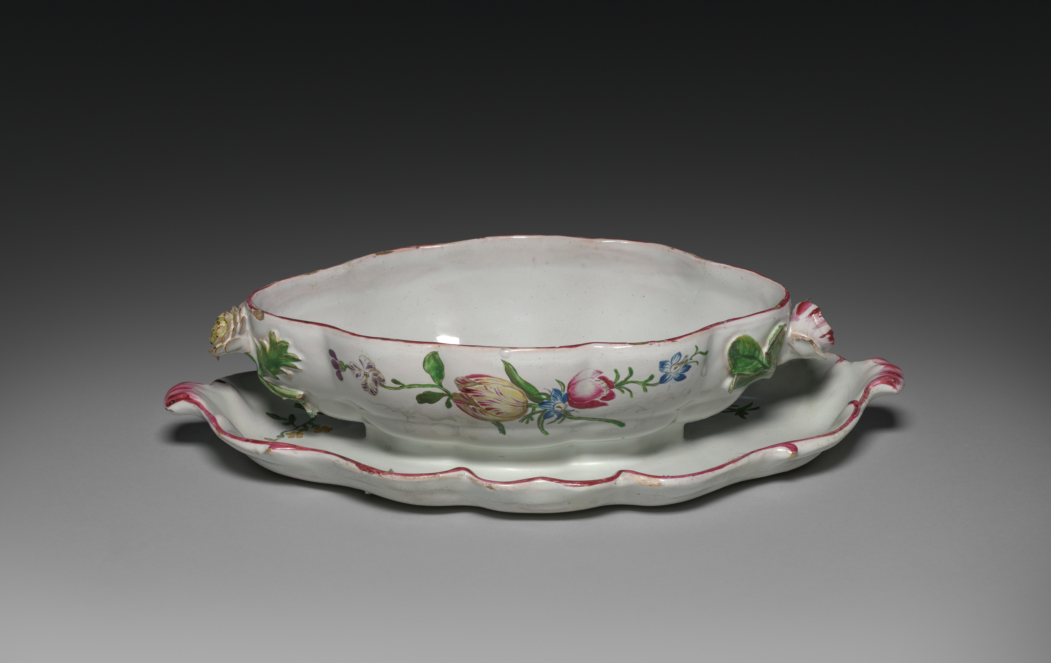White sauce tureen with attached stand, having a wavy rim on both the tureen and the stand. The tureen and stand have red trim along their rims. Colorful floral decorations adorn the tureen. The stand has an indentation in its center where the tureen sits. The background is dark gray to light grey, transitioning from dark at the top to light at the bottom.