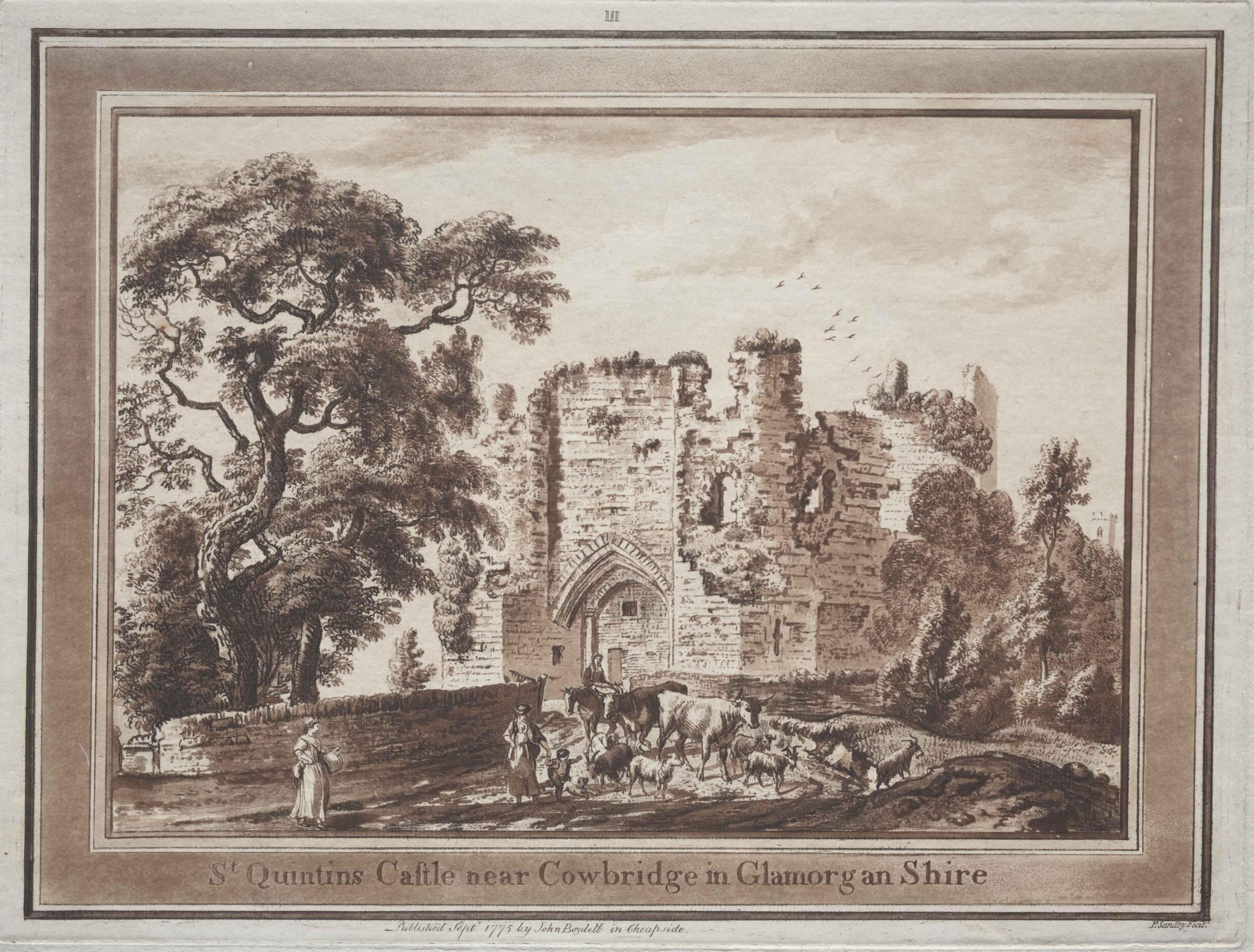 Sepia-toned drawing of a ruined stone castle with a pointed archway in the center; people and a horse-drawn cart in foreground. A flock of sheep. Large tree on left; flock of birds flying on right. Border around drawing. Text at bottom: "St Quintins Castle near Cowbridge in Glamorgan Shire." Small text below. Number "III" at top.