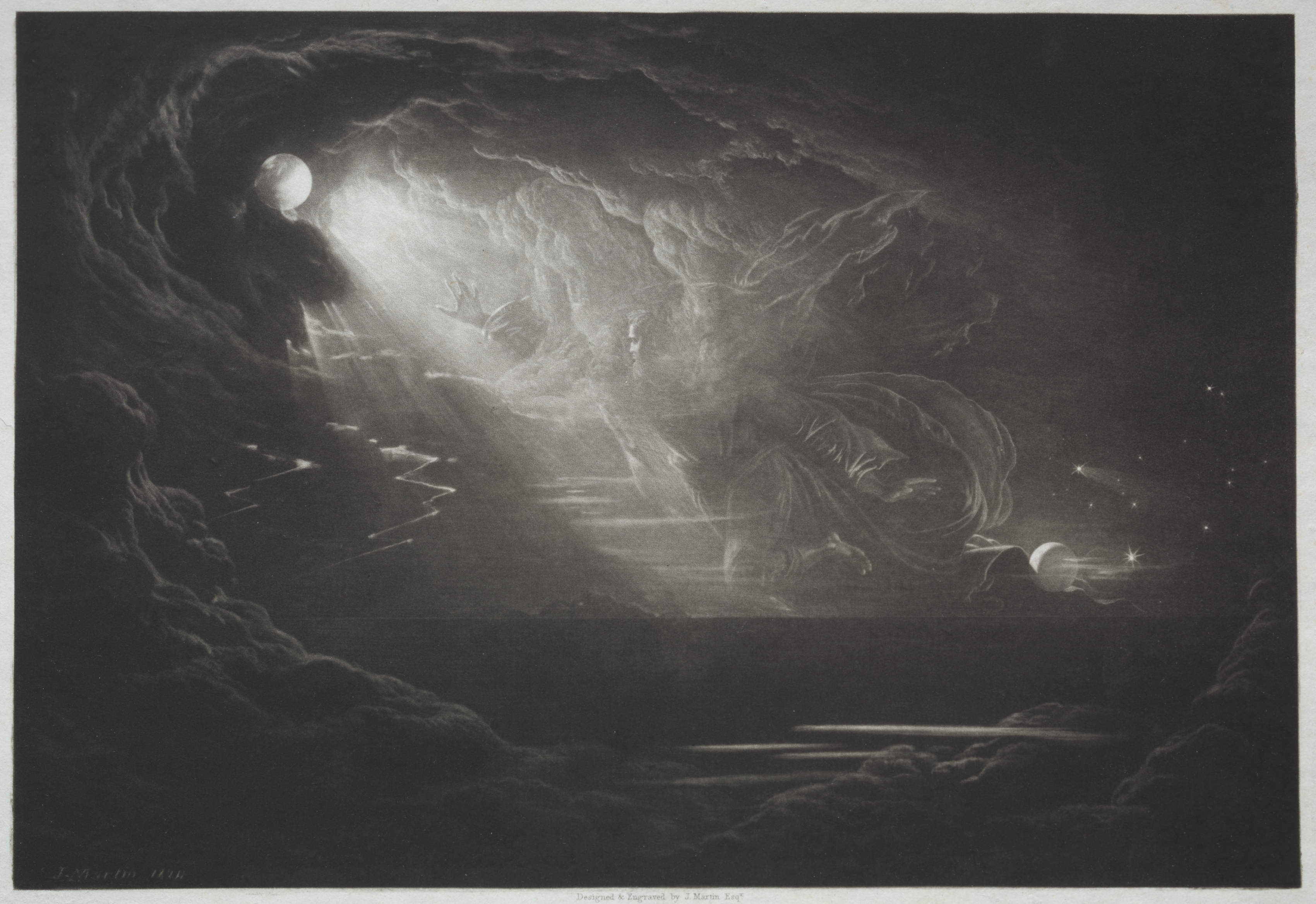 The image depicts a dark scene with a figure kneeling on the right side. The figure wears a long, flowing robe and has their head bowed. A bright light emanates from the left side, shining through clouds and illuminating the figure. The light source appears to be the sun or moon peeking through the clouds. The background features a dark sky with stars and clouds. A body of water is visible at the bottom of the image. The overall atmosphere suggests a dramatic and possibly biblical scene. The image is a work by John Martin, titled "Paradise Lost: The Creation of Light". The image is in black and white.