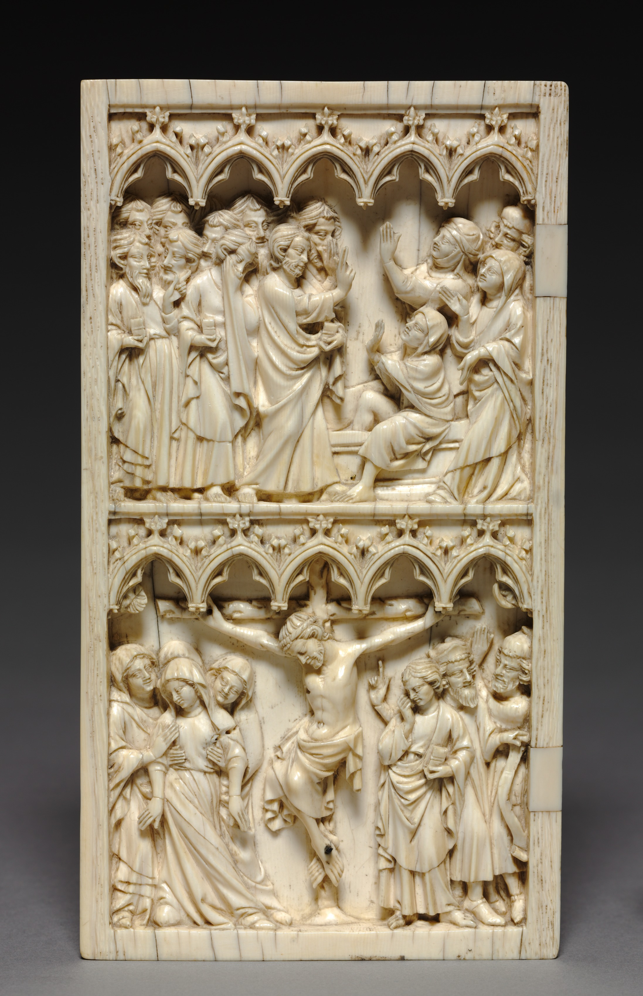 Rectangular ivory relief sculpture with two scenes. Top scene depicts a man in a long robe standing with right arm raised, left arm bent at elbow, standing over another figure on the ground; onlookers to the left and right. Top scene has three arches above figures. Bottom scene depicts a crucified man with outstretched arms and a crowd of onlookers; some figures have hands clasped or raised. Bottom scene also has three arches above figures. Figures wear robes; some have head coverings. The relief is set against a dark background. The relief is likely by an unknown artist and titled "Diptych with Scenes from the Life of Christ (left wing: Raising of Lazarus and Crucifixion)".