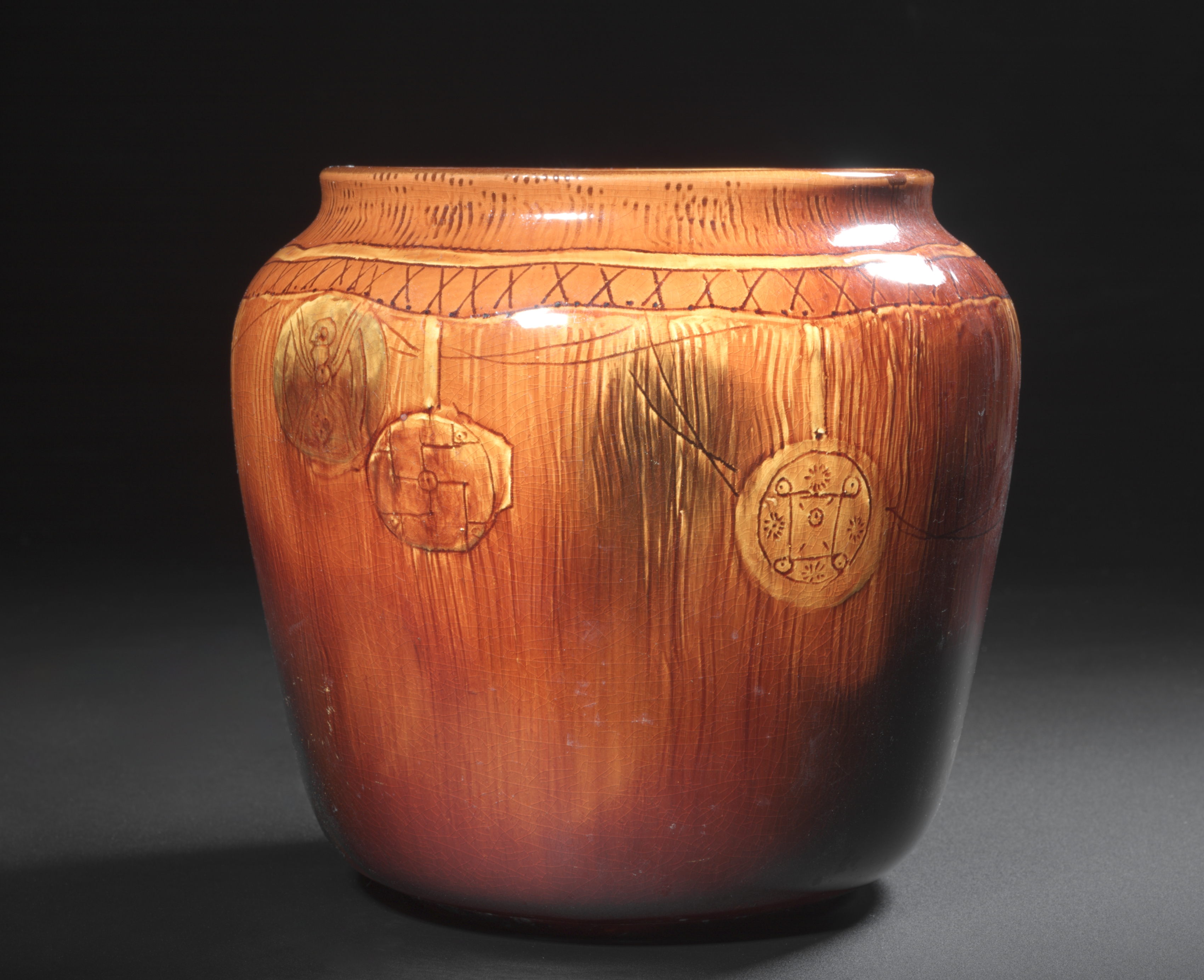 The vase is a rounded, bulbous shape with a wide mouth and a narrow opening. The body of the vase is predominantly orange-brown with darker brown undertones at the bottom. The vase features a glossy glaze with a woodgrain pattern. Three circular medallions are suspended from a line that encircles the top third of the vase. The medallions are light brown with darker designs. A decorative line encircles the top of the vase, featuring an interlocking geometric pattern. The background is dark gray, with a lighter gray surface that the vase sits on.
