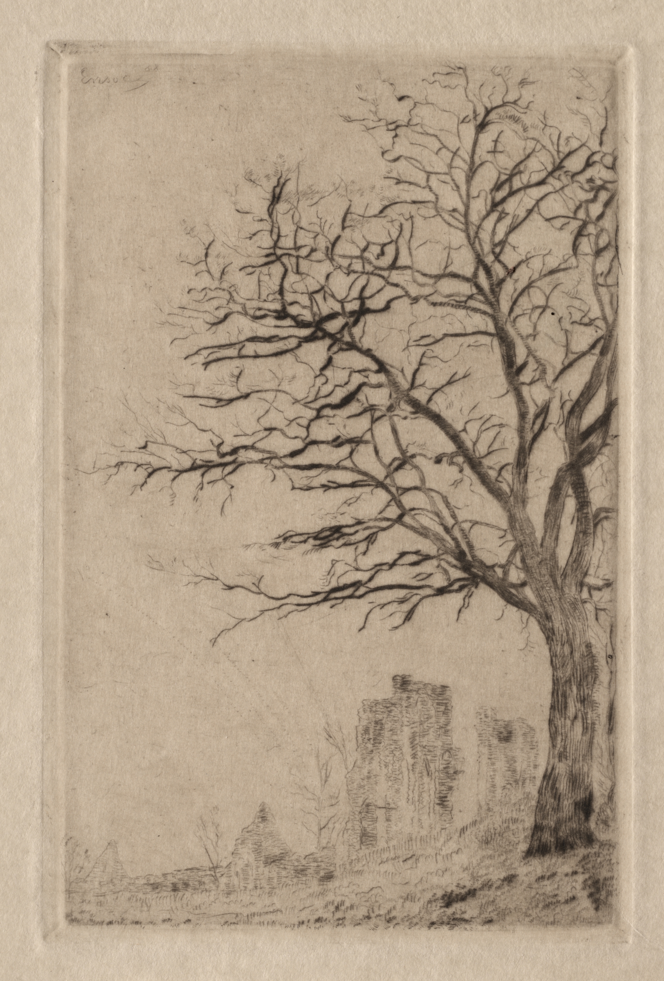The image shows a sepia-toned artwork titled "Acacia" by James Ensor. The artwork features a large tree with bare branches on the right side. The tree has a thick trunk and many thin, curved branches. In the background, there are some indistinct structures. The sky above appears to be a solid, flat tone. The artwork has a rectangular shape with a slightly raised border around the edge. The border is thicker at the corners. The artwork's surface appears textured. The image is in shades of brown. The background behind the artwork is white.