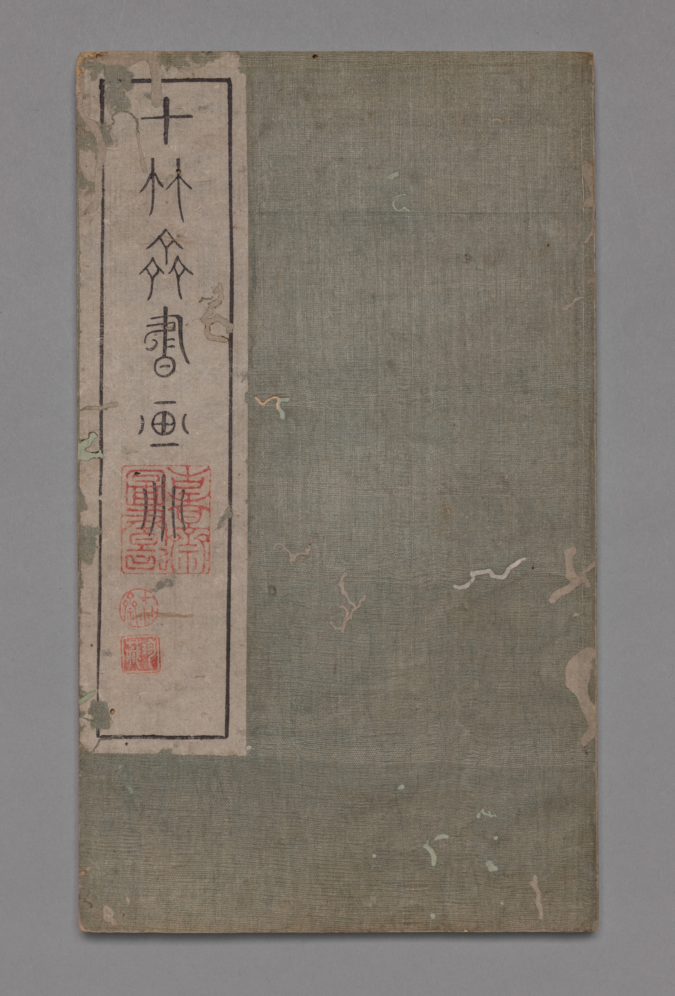 The image shows a book cover with a grayish-brown background. The cover is rectangular and oriented vertically. The right side of the cover is a solid grayish-brown color with some darker spots and light-colored peeling patches. The left side has a strip of lighter-colored paper with black and red Chinese characters. The strip of paper has a black border. Some of the characters are written vertically. The red characters are stamped and appear to be seals. The background behind the book is solid gray.