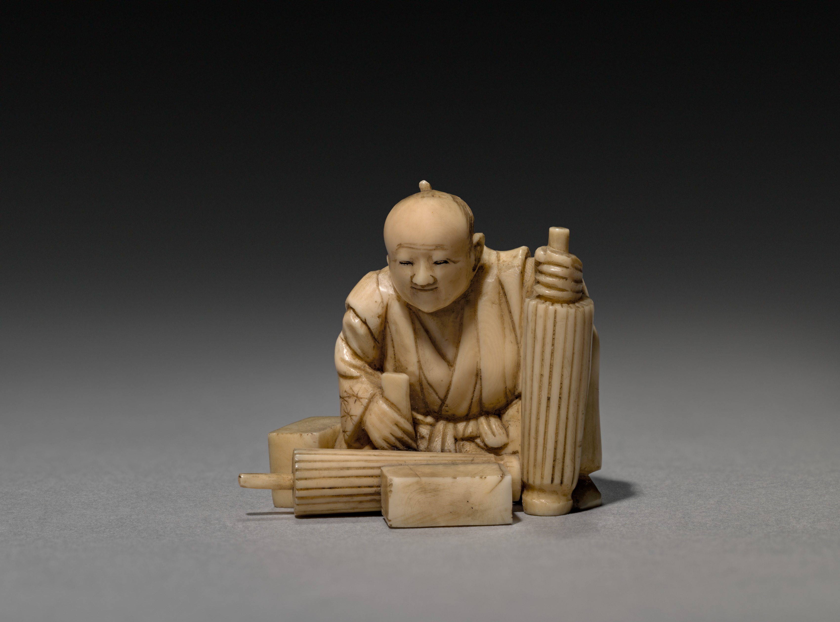 The image features a sculpture of a man by the name of "Parasol Vendor". The sculpture depicts a man with a bald head, wearing a robe, crouched down. The man has one hand on a cylindrical object and the other on a rectangular object. There are various rectangular and cylindrical objects around the man, including one with a handle. The sculpture appears to be made of ivory or bone. The background is gray, with a gradient from dark to light. The sculpture sits on a flat surface. The artist's style suggests it may be an example of Japanese art.