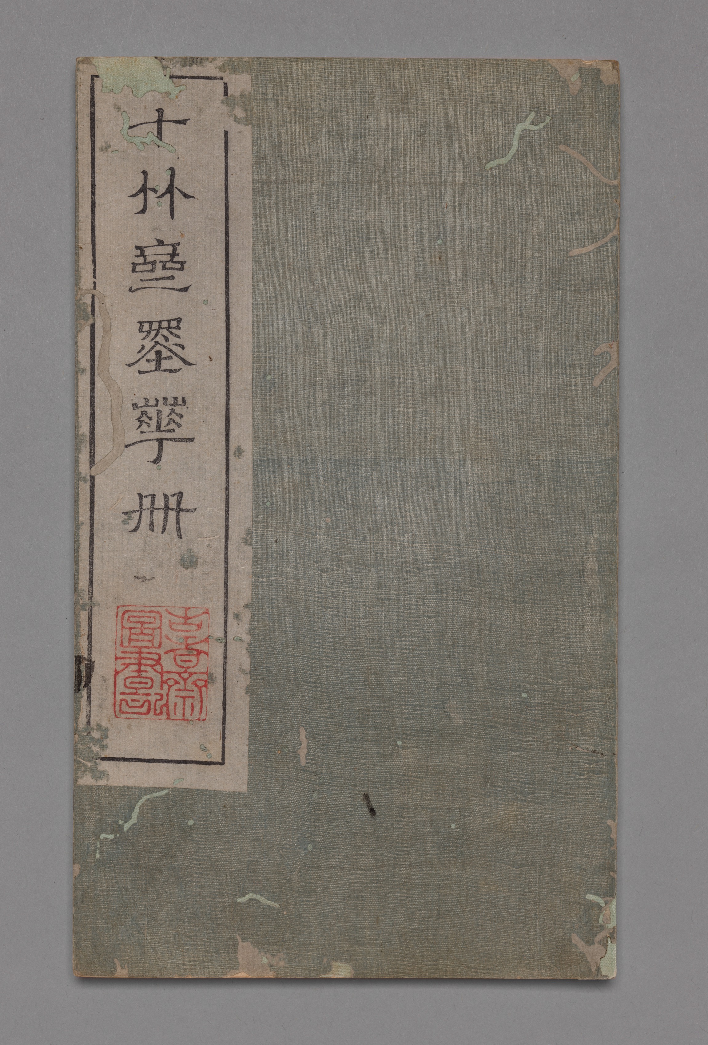 The image shows a worn, rectangular book cover with a vertical strip on the left side. The cover is primarily a faded greenish-gray color with visible signs of wear and tear, including peeling and discoloration at the corners and edges. The vertical strip on the left side is beige with a thin black border. It features seven lines of black Chinese characters. Below the characters, there is a red seal or stamp. The background of the image is a solid gray color.