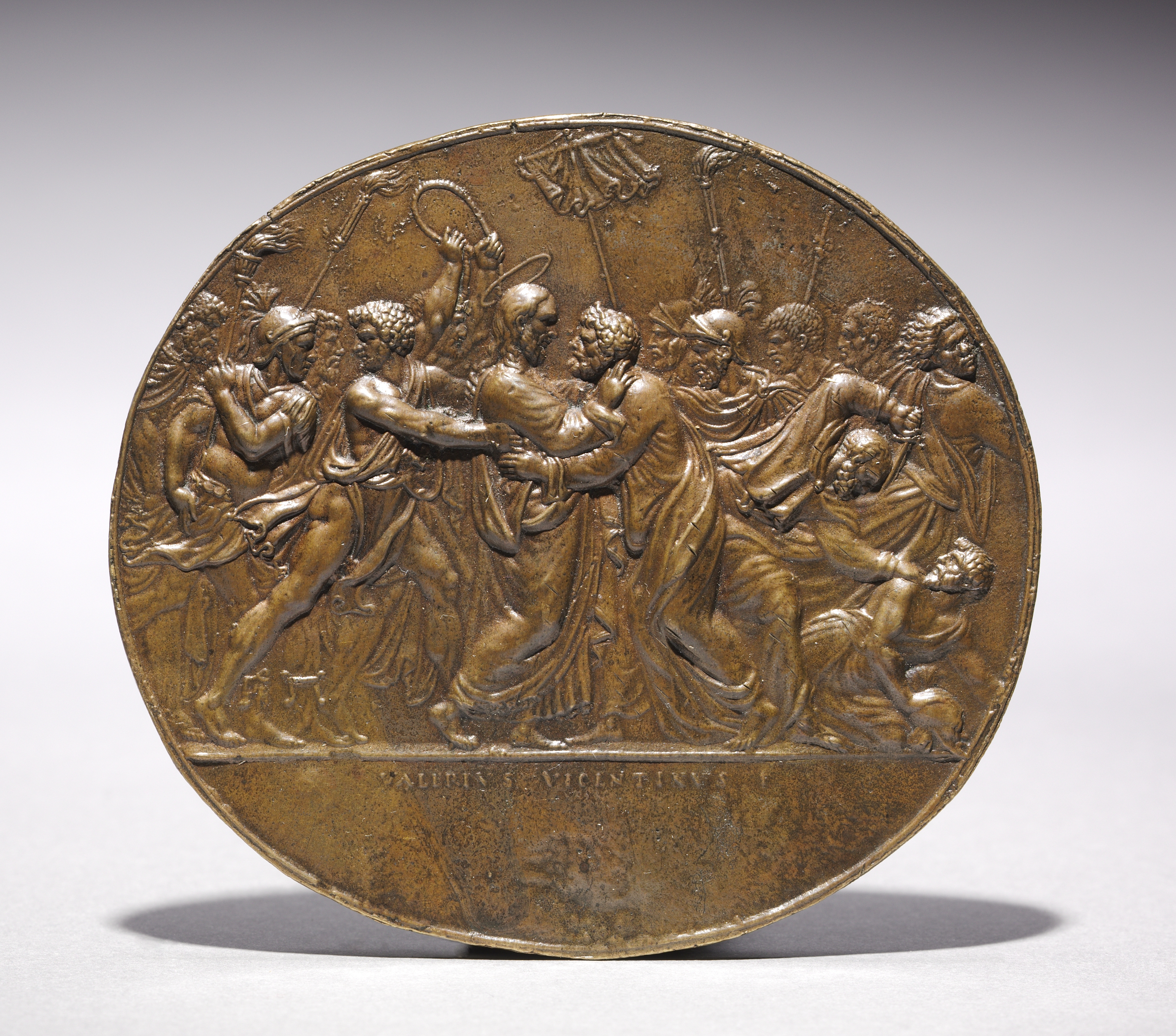 The image shows a bronze relief medal. The medal is circular and has a raised relief on its surface. A group of men in robes are depicted in a scene. One man, with long hair, is being grabbed by another man. To their left, another man covers his face with his hands. The scene is chaotic, with several people shown. The artist's name is inscribed along the bottom edge. The background of the image is gray. There is a shadow under the medal. The overall mood seems intense. The image depicts "The Betrayal of Christ" by Valerio Belli.