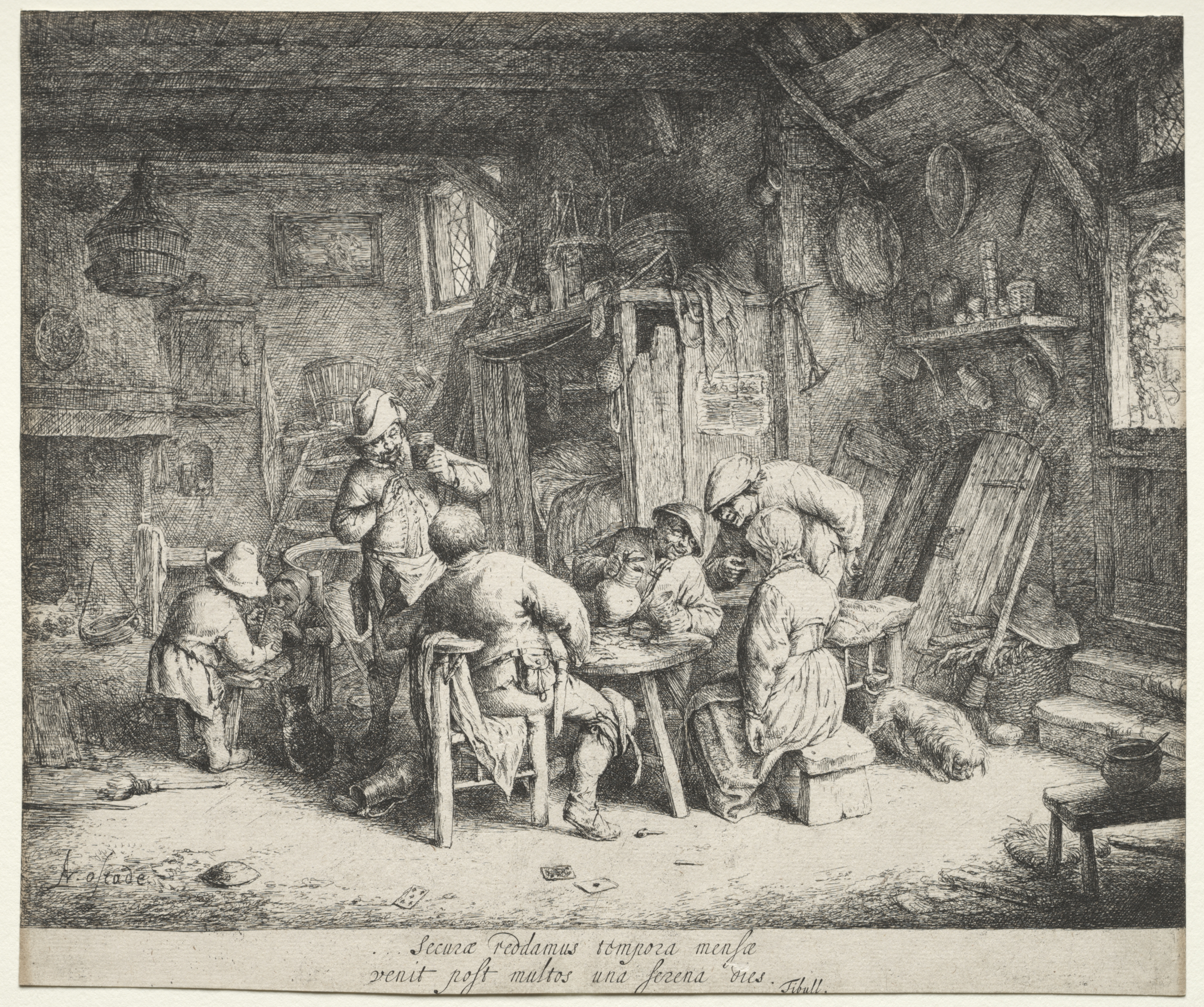 The image depicts a black and white drawing titled "The Breakfast" by Adriaen van Ostade. The scene shows a group of people eating and drinking in a rustic interior. Six people are present, with one man sitting at a table on the left playing a pipe, another man sitting at the table with his back to the viewer, wearing a hat and an apron, and a woman standing on the right side of the table with her head down. On the left side, a woman is standing by a fire, while a child is sitting on the floor. The room features a wooden table and benches, with a dog lying on the floor. The walls of the room have various kitchen utensils and a birdcage hanging from the ceiling. A window on the right lets in natural light. The overall atmosphere appears to be a casual, everyday scene of rural life. The image is rendered in detailed, realistic linework.