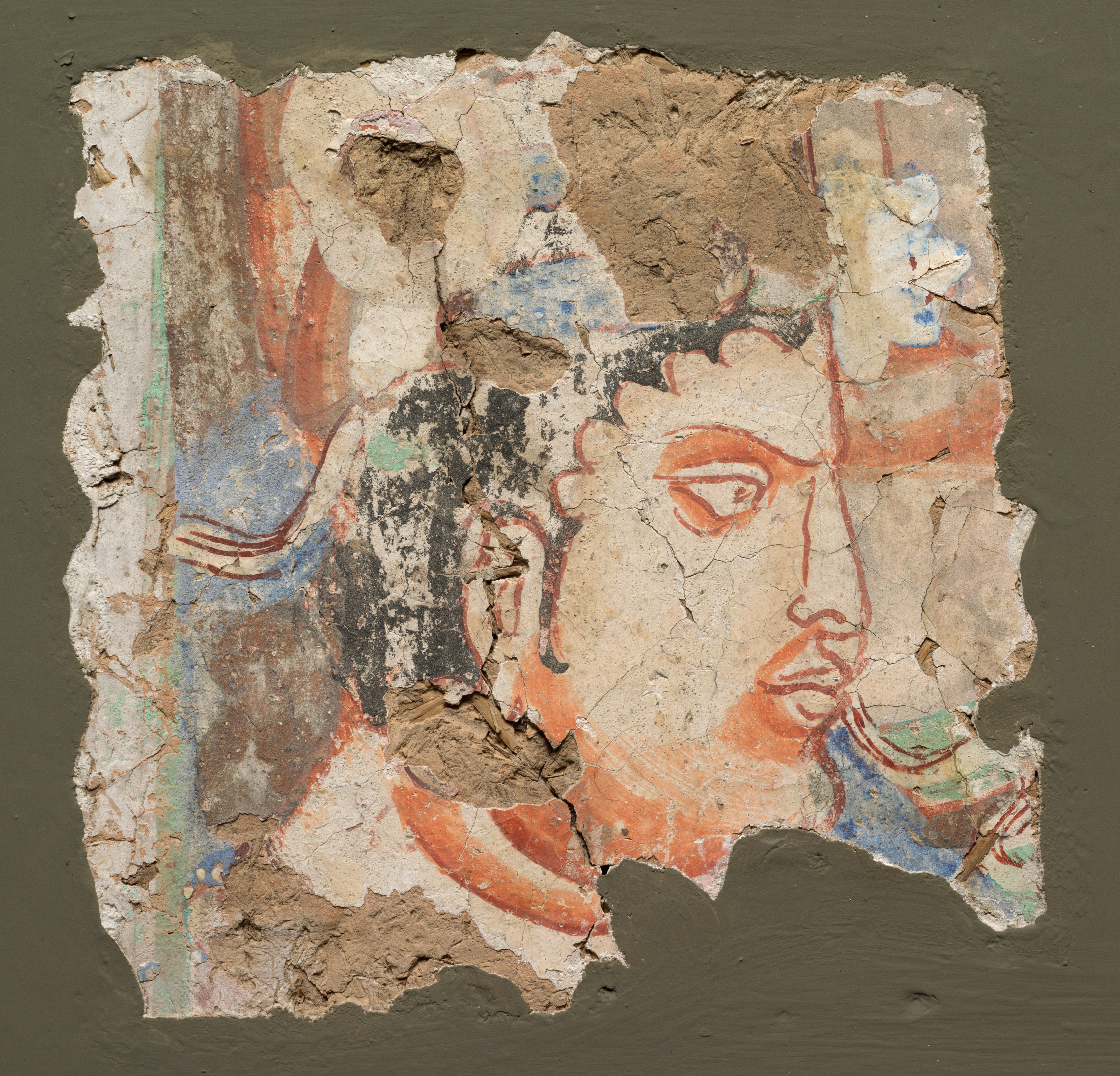 A fragment of a mural painting, titled "Fragment with a Head of Bodhisattva" by an unknown artist. The fragment is roughly rectangular with irregular edges and a rough texture, appearing to be a piece of plaster that has broken off from a larger surface. The background of the fragment is beige with patches of brown and gray. A face is painted on the right side in orange and red hues with one visible eye, one eyebrow, nose, and mouth. The face is surrounded by a blue and green area on the bottom right and a red and orange area on the top right. On the left side, there are blue, green, and red areas with three horizontal red lines. The fragment is set against a dark green background.
