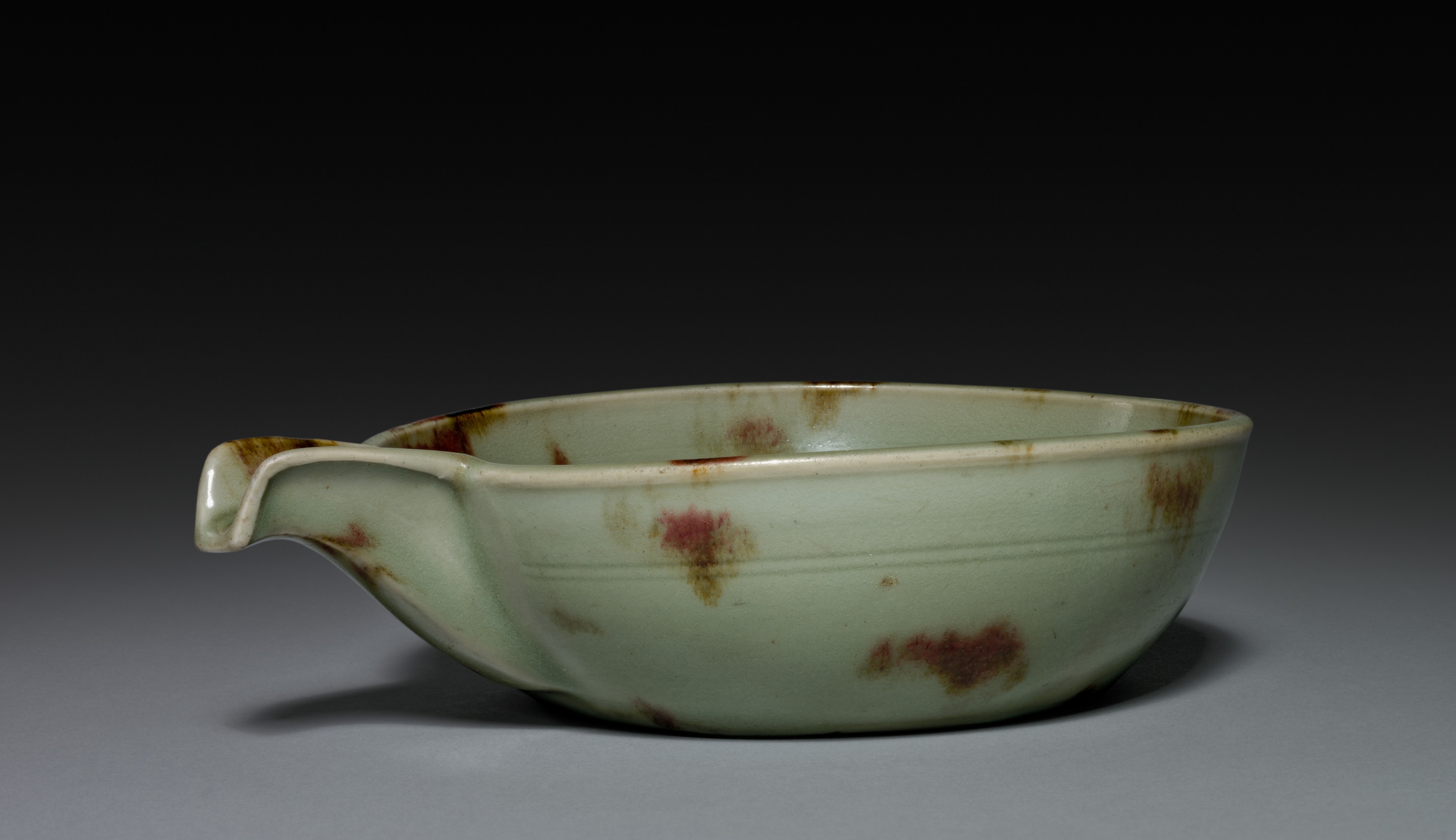 The Spouted Bowl by artist is a ceramic bowl with a spout on one side. The bowl has a light green glaze with brown and red spots. It has a wide, shallow body with a rounded shape and a small spout protruding from one side. The bowl has a small lip around the edge and two horizontal lines around the middle. The background is dark gray, with a lighter gray surface that the bowl is sitting on.