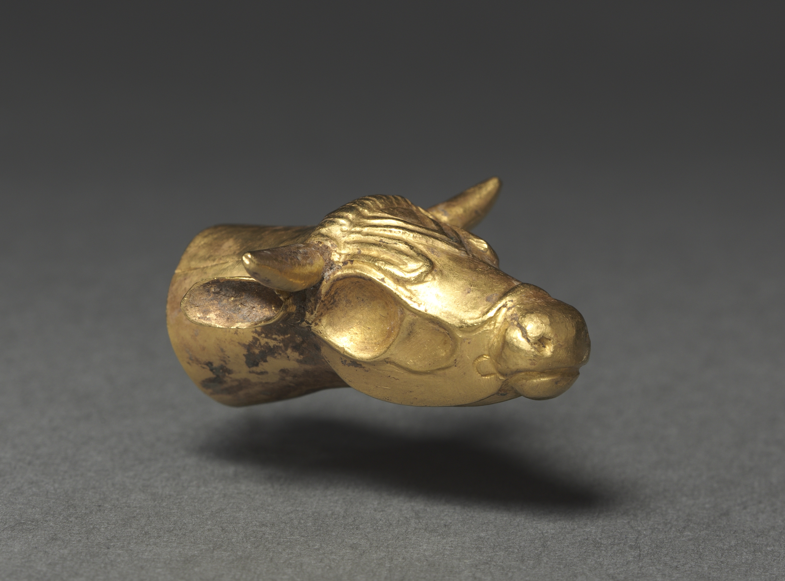 The image shows a gold-colored metal object. The object depicts the head of a bull or cow. It has a short, blunt horn protruding from the top of its head. The object appears to be made of gold or brass and has a smooth, shiny surface with some darker spots. The background is dark gray with the object casting a shadow on the surface below it. The title is Bovine Finial by an unknown artist.