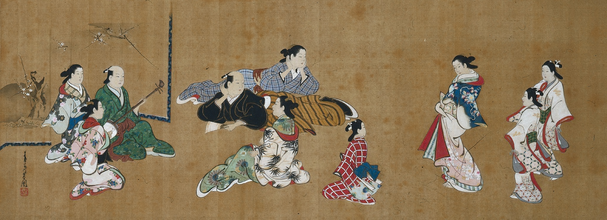A painting of a group of people in traditional Japanese clothing on a light brown background. The people are sitting and kneeling. One person on the left side of the image holds a stringed instrument. The people are wearing kimonos in various colors and patterns, including green, blue, red, white, and black. The kimonos have floral and geometric designs. There are nine people in total, six women and three men. The women's hair is styled in buns. The people are looking at each other or away from the viewer. There are some branches with blossoms on the upper left. A few characters are written vertically on the left side. The painting appears to be on aged paper.