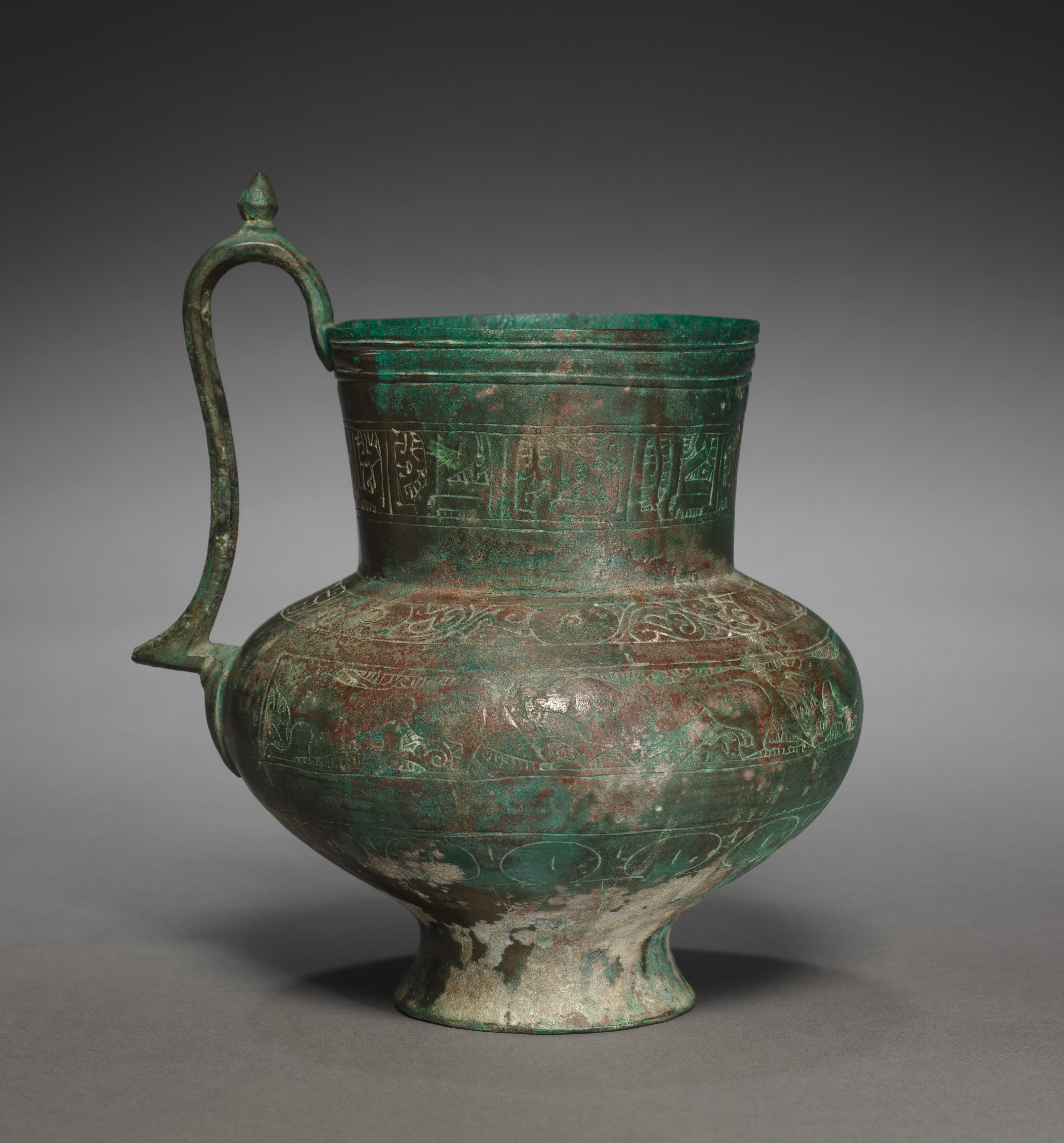 The Jug by unknown artist depicts a greenish-brown ceramic or metal vessel with a bulbous body. The object features a handle on the left side, which extends from the body and curves upwards, ending in a decorative point. The body has a narrow neck and a wide mouth, with a small foot at the base. The surface displays a mix of green, brown, and red hues, accompanied by intricate etchings and designs. The etchings include lines, swirls, and geometric patterns, as well as what appears to be writing or symbols. The background of the image transitions from dark gray at the top to light gray at the bottom, with a subtle shadow cast by the object.