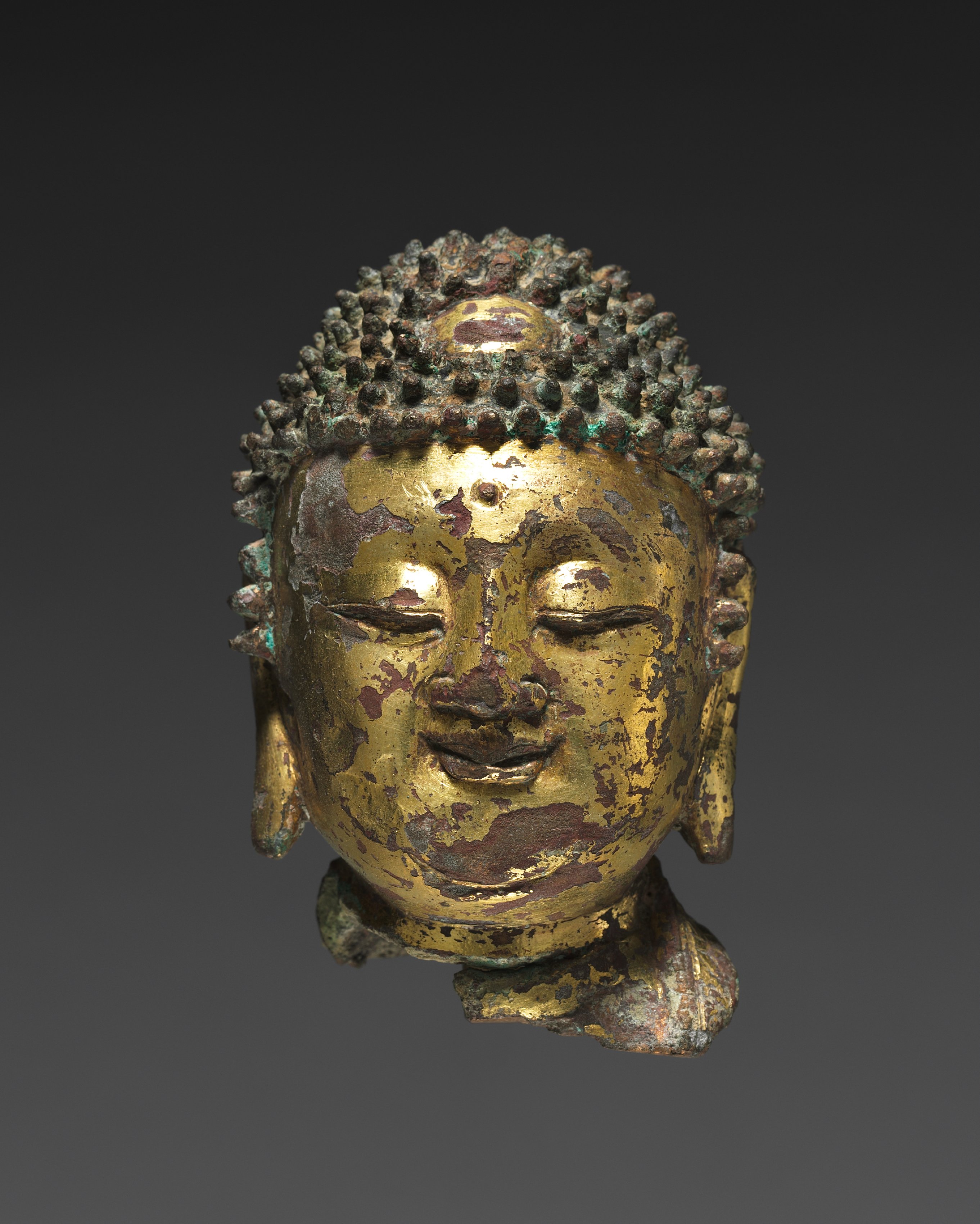 Head of Buddha by unknown artist, gold-colored metal sculpture with a weathered surface exhibiting patches of green patina. Eyes are closed, face serene. Top of head features small bumps arranged in rows, with a larger bump at the center. Ears are long and hanging. Background is dark gray to black gradient.