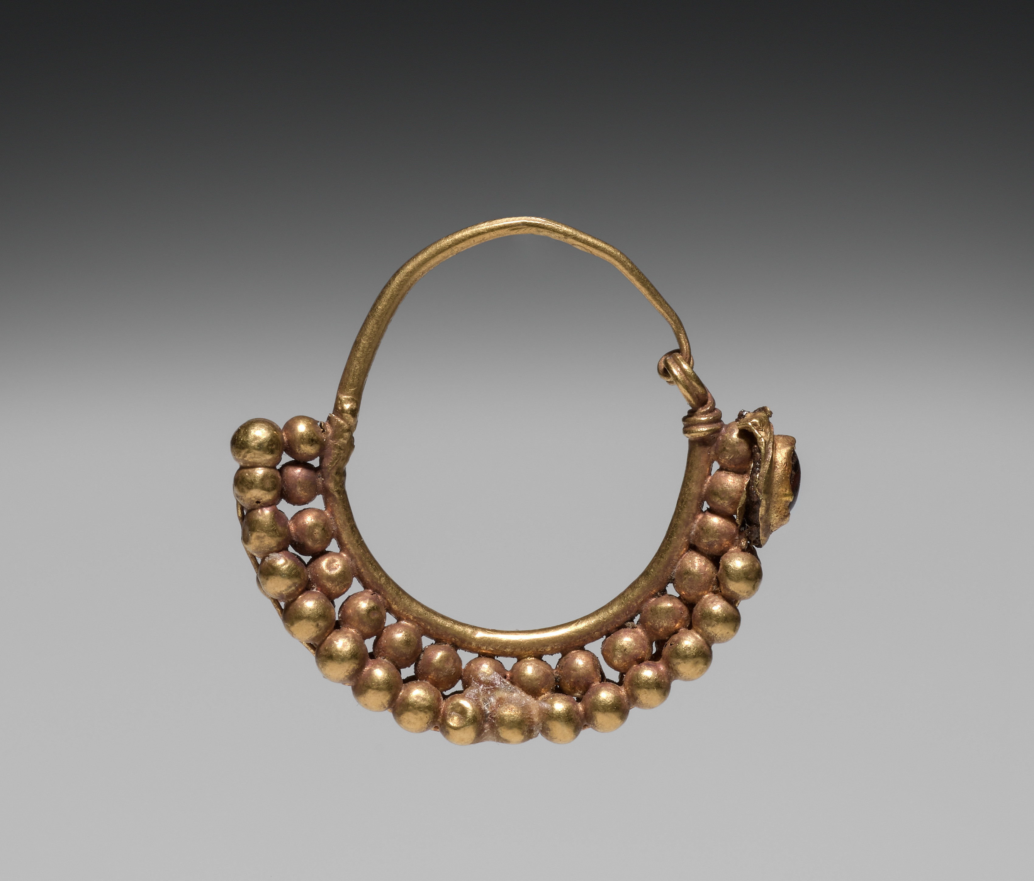 Gold earring, one of a pair, consisting of a thin metal hoop with a hinged opening and a latch at the end. The lower portion of the hoop is adorned with two rows of small granulated gold beads. The background of the image transitions from dark gray at the top to light gray at the bottom.