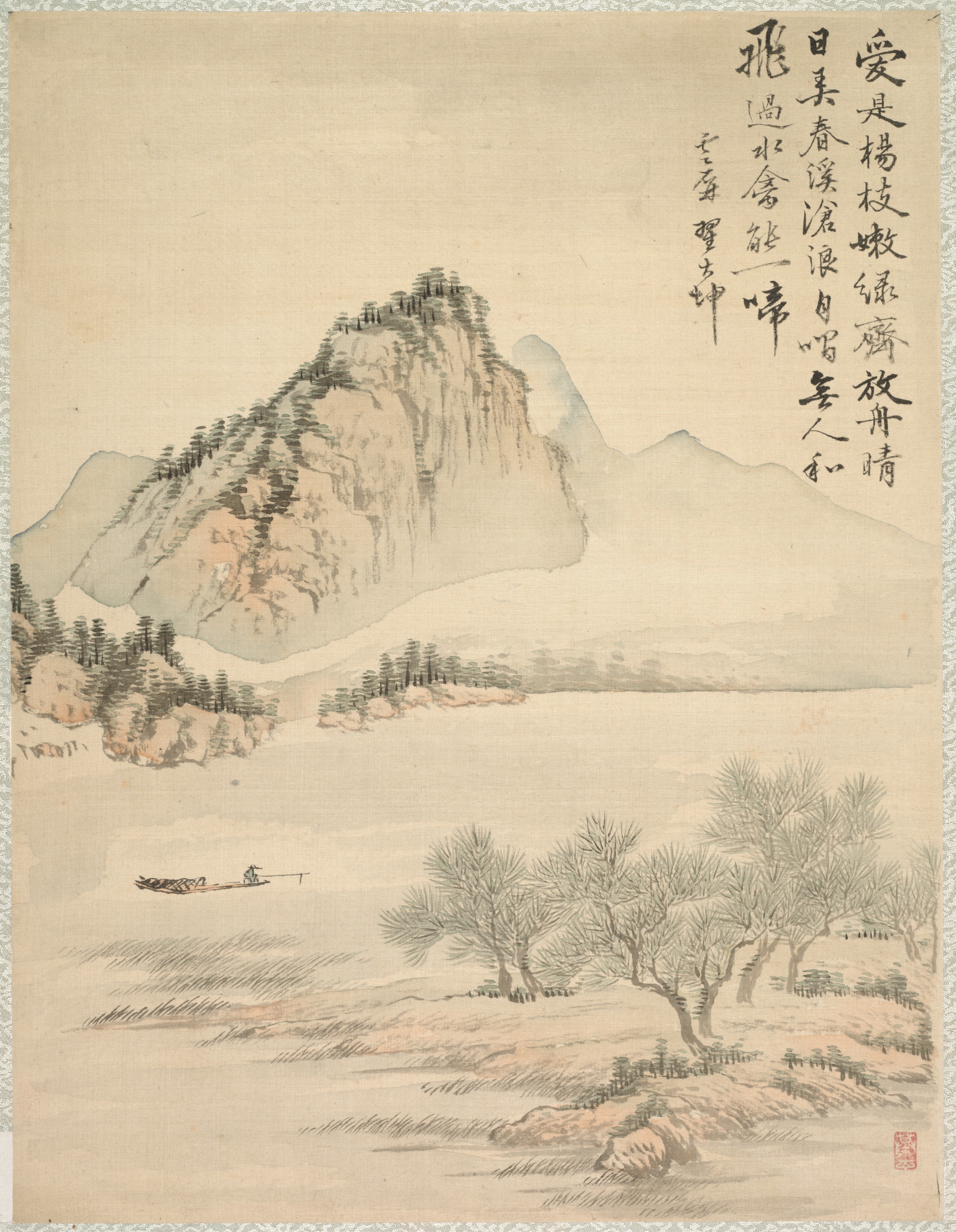 The image depicts a serene landscape with a mountain, trees, and a body of water. A boat with a single person is on the water. The mountain is large and gray, with trees on top and to the left. In the foreground, there are several bare trees on a small hill. The sky is light-colored and hazy. Chinese calligraphy is written vertically on the right side of the image. A red seal is in the bottom-right corner. The overall color palette is muted, with shades of beige, gray, and brown. The image has a decorative border around the edges.