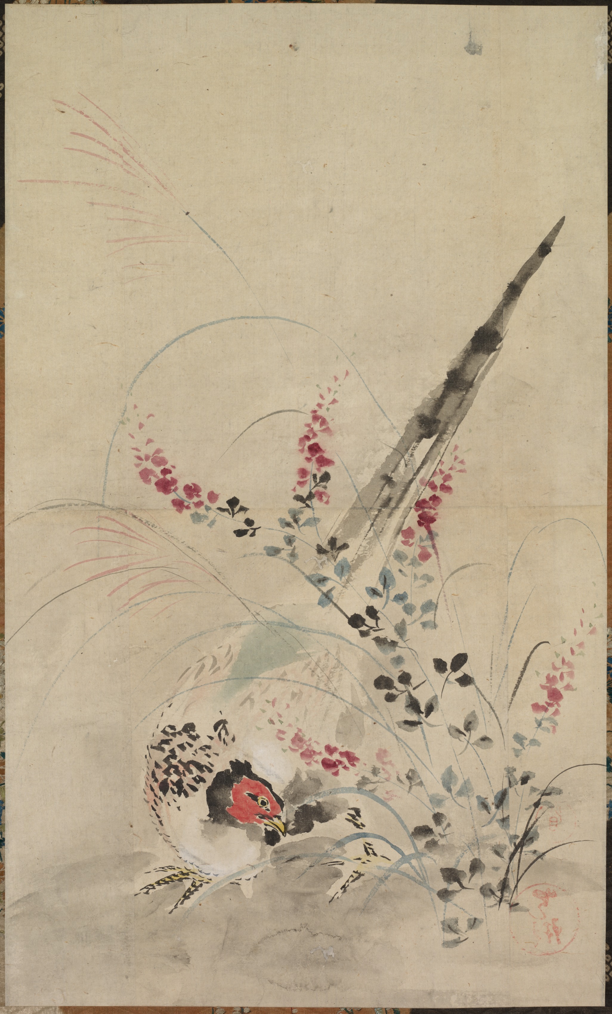 A painting of a pheasant facing right, with white body, black spots on body and tail, and red face. The pheasant is surrounded by grasses and pink flowers. The background is beige with some darker spots and lines. There are curved blue lines behind the pheasant and plants. A red seal stamp is in the bottom right corner.