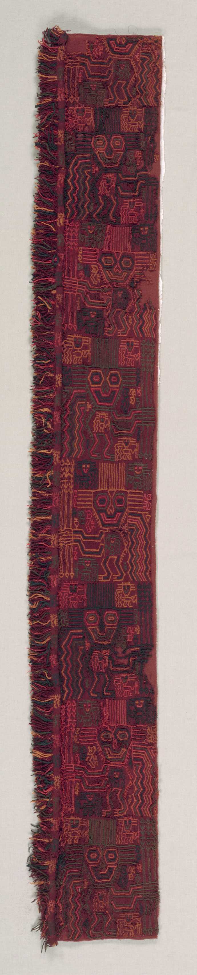 Red and brown textile fragment with a repeating pattern featuring a figure with large eyes; figure has a rectangular body with zigzag lines on sides; figure appears to have long arms; background has small squares; edges have short, thin fringe. Title: Mantle Border Fragment with Oculate Being. Artist unknown.