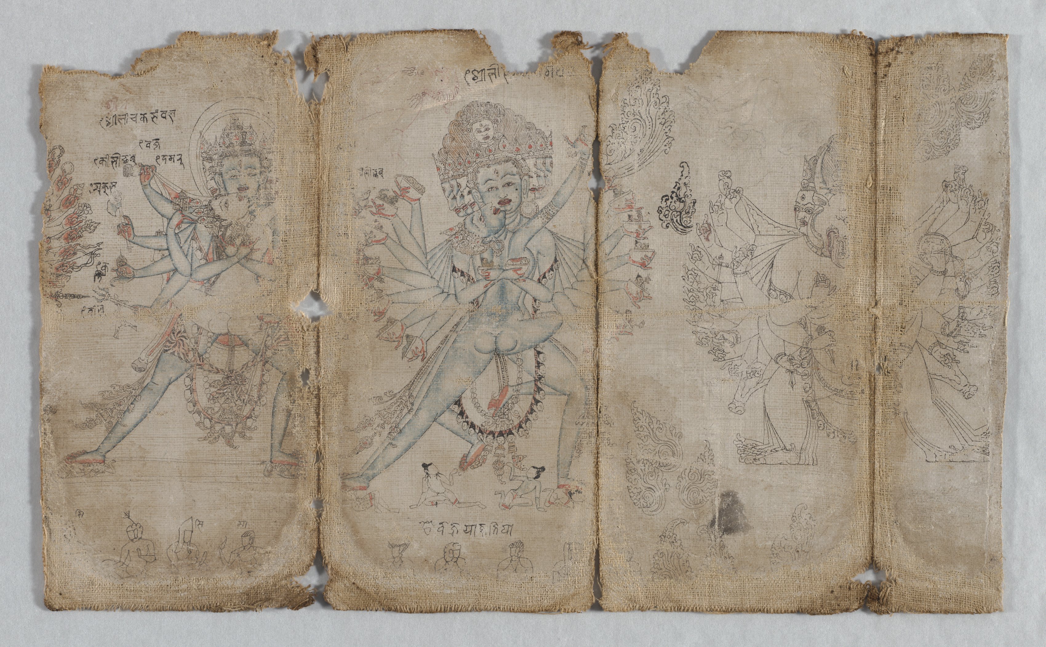 The image depicts a worn, aged piece of fabric with four panels featuring drawings of multiple deities. The fabric appears to be made of a light-brown material, possibly burlap or similar fabric, with frayed edges. * **Left Panel** * A drawing of a deity with multiple arms and legs. * The deity has a crown on its head. * The deity is holding objects in some of its hands. * There are other smaller drawings and writing on the panel. * **Second Panel from Left** * A drawing of a deity with multiple arms and legs. * The deity appears to have a second figure on top of its head. * The deity is holding objects in some of its hands. * There are other smaller drawings and writing on the panel. * **Right Two Panels** * Faded drawings of deities. * The drawings are not as detailed as those on the left two panels. The image shows a piece of fabric with intricate drawings of deities and other figures, likely from an ancient or cultural context. The fabric's aged appearance and frayed edges suggest it may be a relic or artifact. Without more information, the exact meaning or significance of the image cannot be determined.