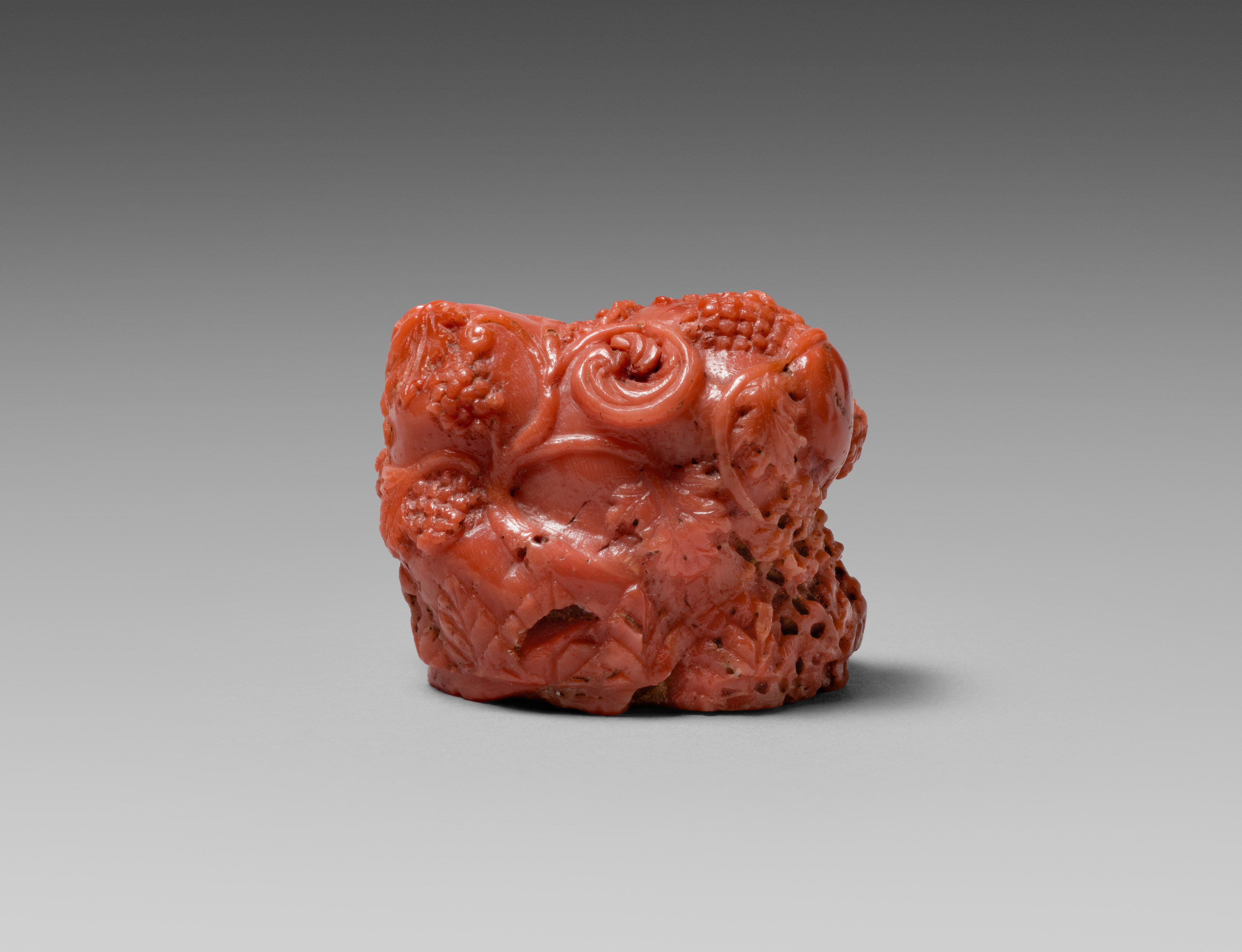 Red coral sculpture with intricate carvings, shiny surface, and small black specks; depicts curved shapes and spiral; sits on a gray surface with a dark gray background. Sword Hilt.