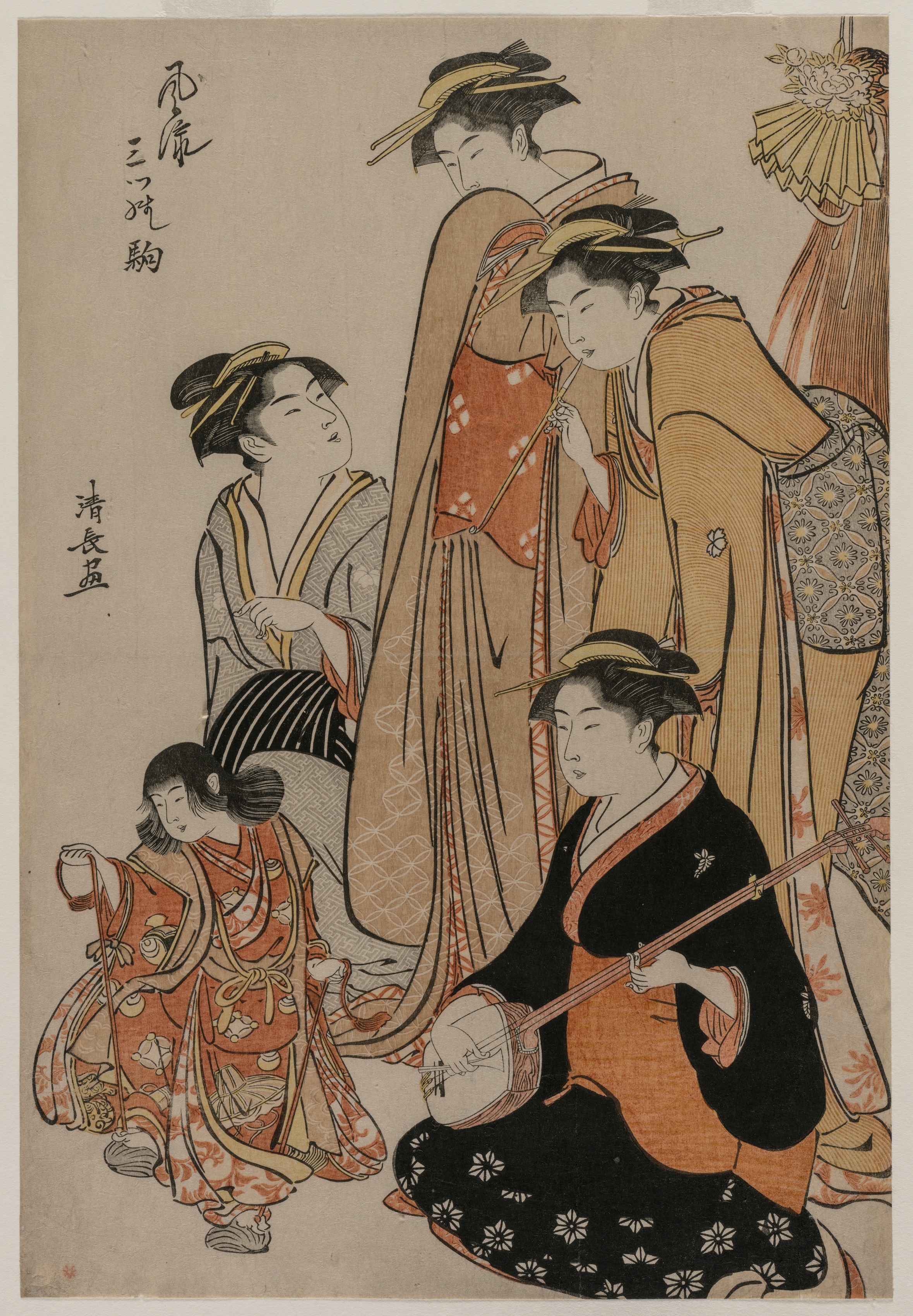 A group of six women wearing traditional Japanese kimonos and headpieces. The woman in the bottom right corner sits on her knees, playing a shamisen. The woman on the left side faces right and crouches on one knee. The four women on the right side are standing, leaning near each other and looking down to the right; one woman holds a closed parasol. The background is beige with Japanese text written vertically on the left side. The color palette includes orange, red, black, beige, and white.