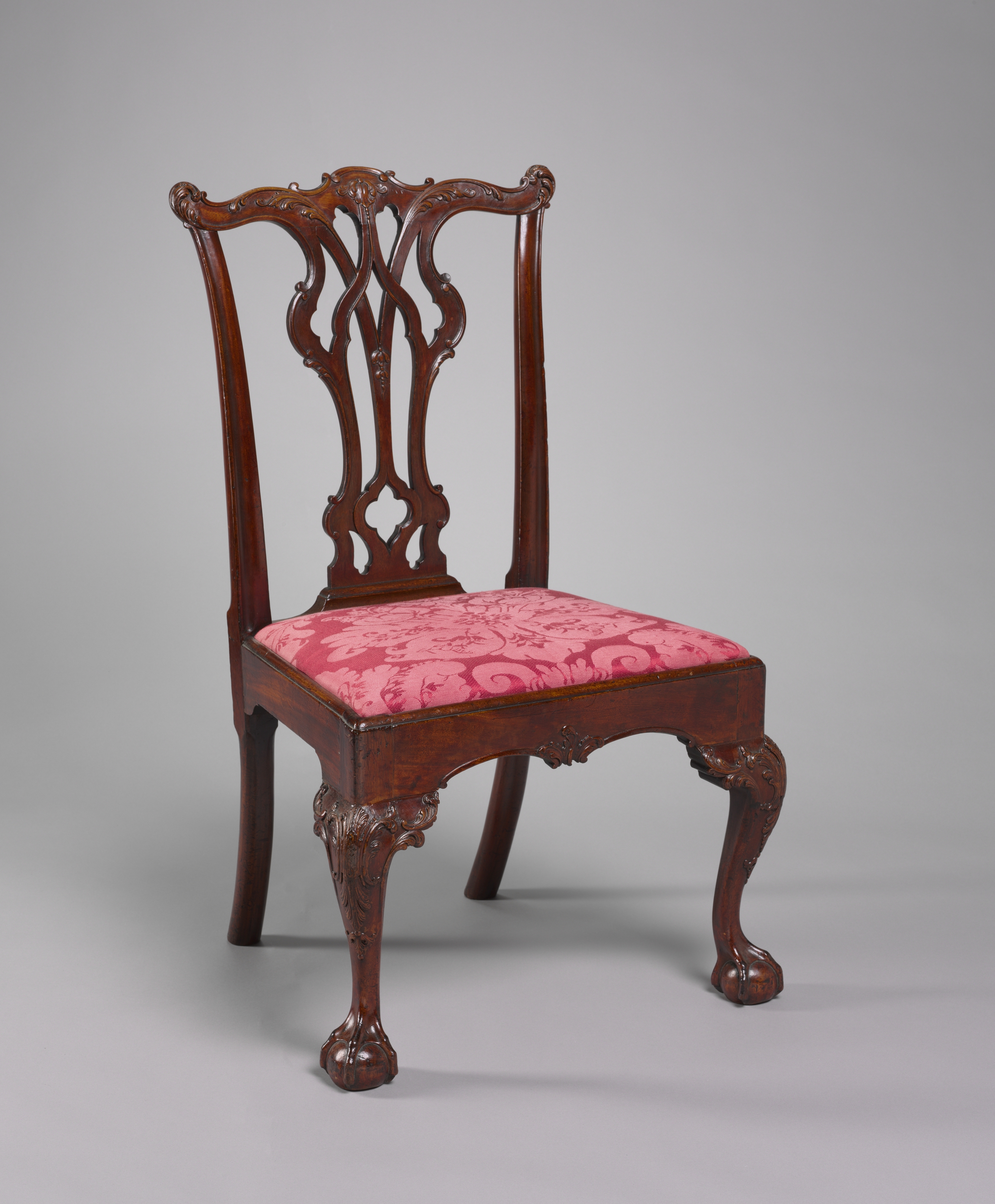 The Side Chair has a dark brown wooden frame with a high back. The back features curved, wavy lines in the center that form an intricate design. The chair's seat is upholstered in pink fabric with a floral pattern. The chair's four legs curve outward and are shaped like animal paws at the bottom. The chair appears to be ornately carved with decorative elements on the legs, frame, and back. The background of the image used to display the chair is gray.